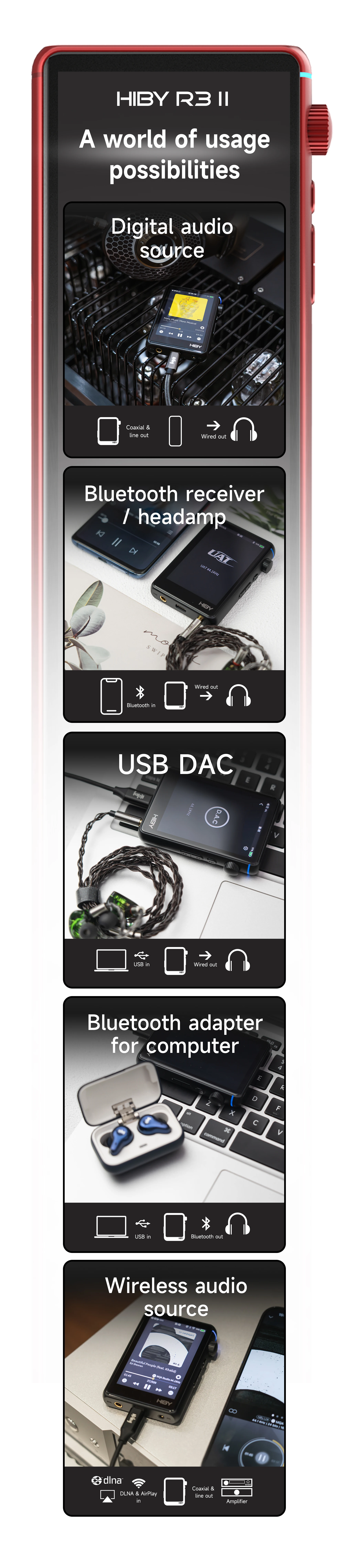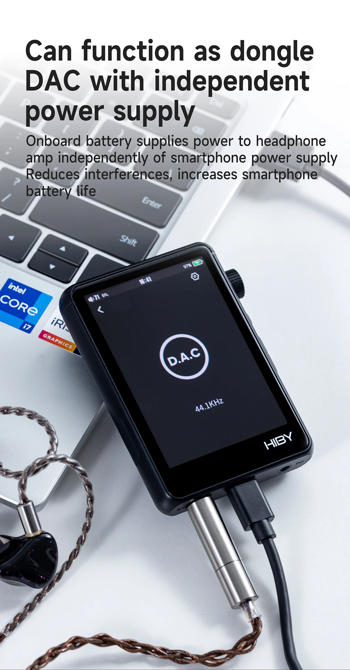 HiBy R3 II también se puede utilizar como un DAC USB con su teléfono, tableta, ordenador portátil y PC. La batería a bordo proporciona una amplia potencia a los auriculares independientemente de la fuente de alimentación del teléfono inteligente.