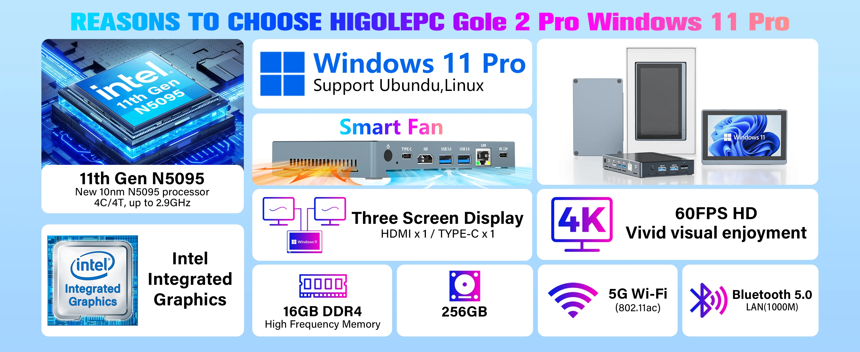 El HigoleGole 2 Proviene precargado conWindows 11 prosistema operativo con licencia válida y admite sistemas operativos comoubuntu/linux.La mini PCcon ventiladorestá equipado con un potenteCeleron N5095 de 11.a generaciónprocesador,8/16 GB de RAM LPDDR4 y 256 GB de eMMC, haciéndolo compacto y potente.Con un procesador de 4 núcleos y 4 hilos que funciona hasta2,9 GHz, esta mini PC ofrece un rendimiento más estable y eficiente que su predecesor, el Gole 1 Pro Celeron J4125.