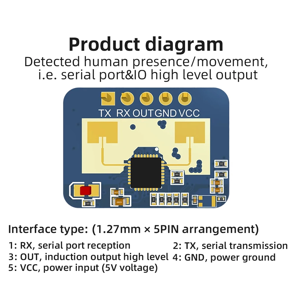 El principio de funcionamiento es utilizar onda continua FMCW FM para detectar un objetivo humano en un espacio definido, Y se combina con el procesamiento de señal de radar y los algoritmos precisos de detección de presencia humana para realizar la detección de presencia humana altamente sensible, que puede reconocer a los seres humanos en movimiento y en reposo, Y calcule la distancia del objetivo y otra información auxiliar.