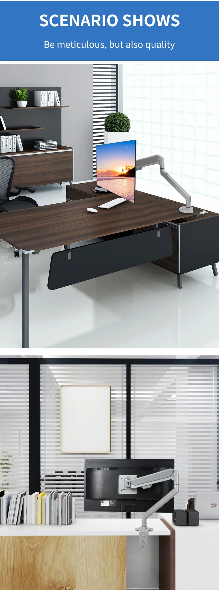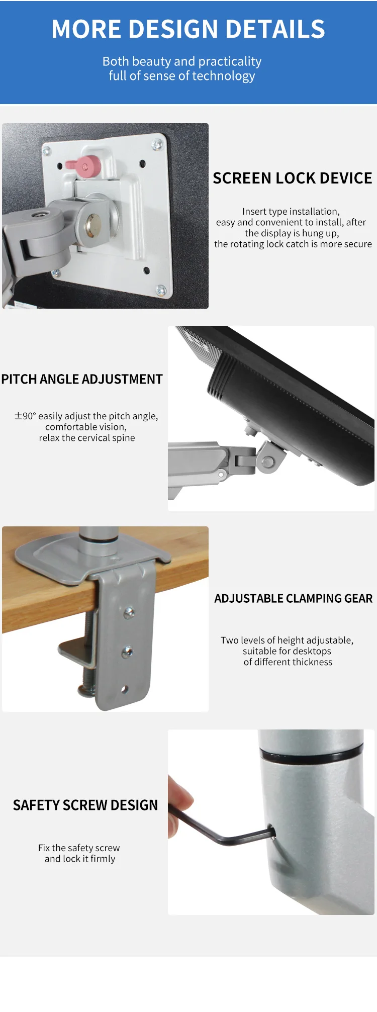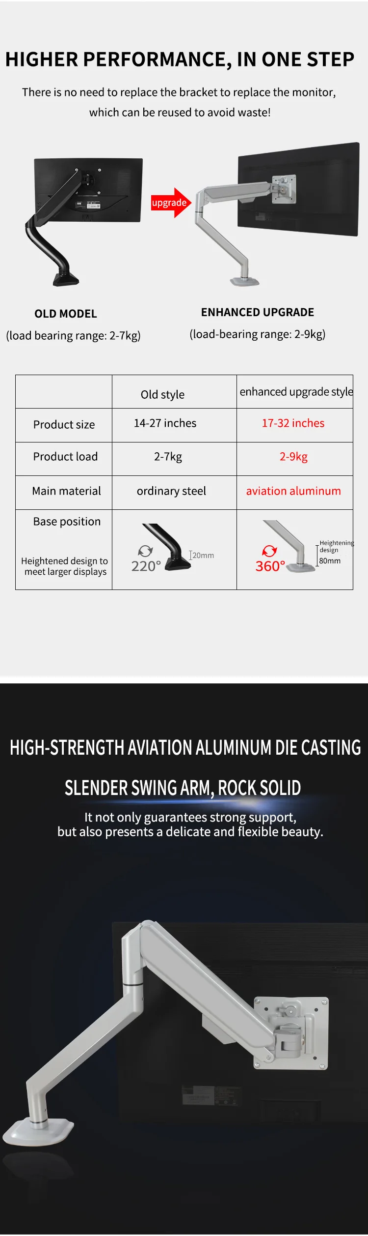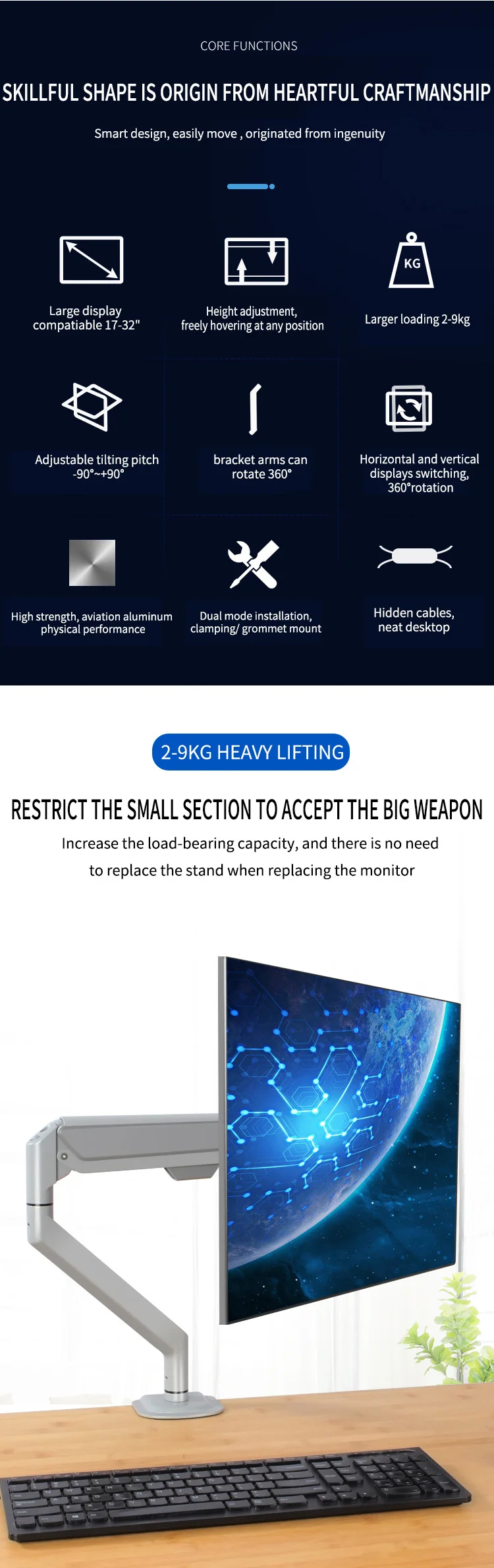 Características: elevación libre, rotación de 360 grados de articulación completa, aluminio de aviación de alta resistencia, pantalla se puede cambiar libremente pantalla horizontal y vertical, cable oculto para hacer el escritorio más limpio, tecnología de pintura de piano, alto brillo, alto nivel de apariencia, abre una nueva experiencia de oficina.