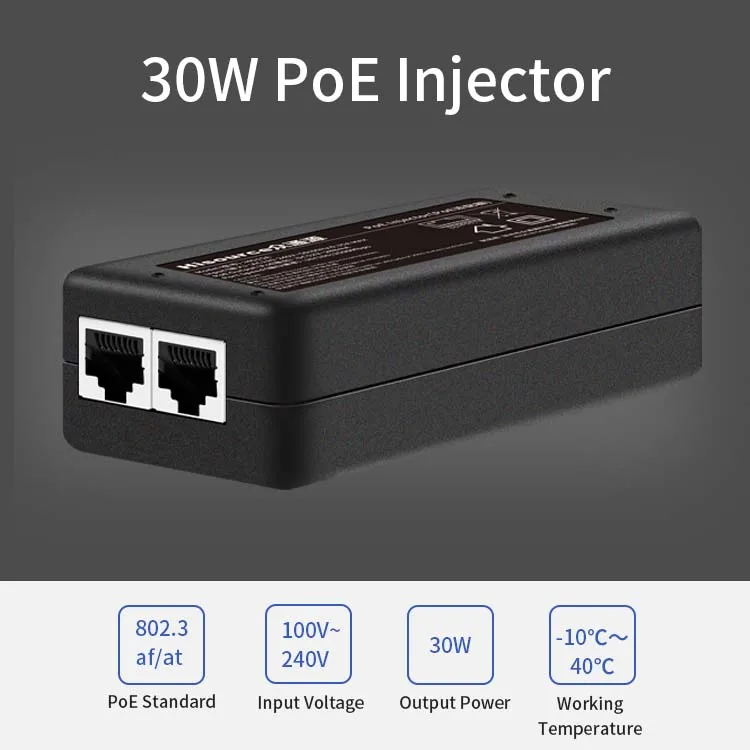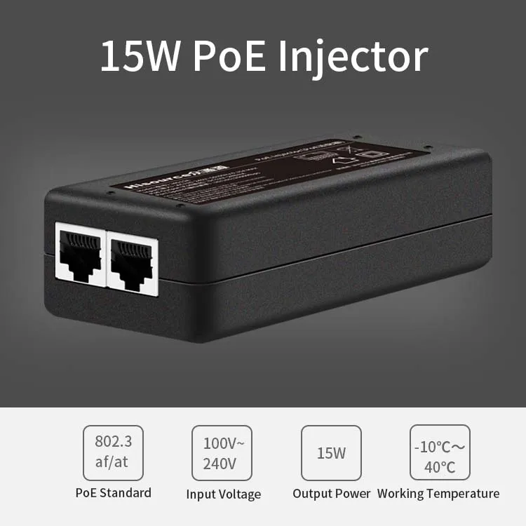 Adaptador PoE Gigabit Ethernet estándar HG15A, este producto proporciona 1 puerto PoE Gigabit y 1 puerto de enlace ascendente Gigabit, admite modo de fuente de alimentación POE de 12+, 36-52 V y solo es aplicable a dispositivos que admiten modo de fuente de alimentación de 12+, 36 en el extremo receptor.Si el extremo receptor utilizado no admite este método, es posible que no pueda suministrar energía.