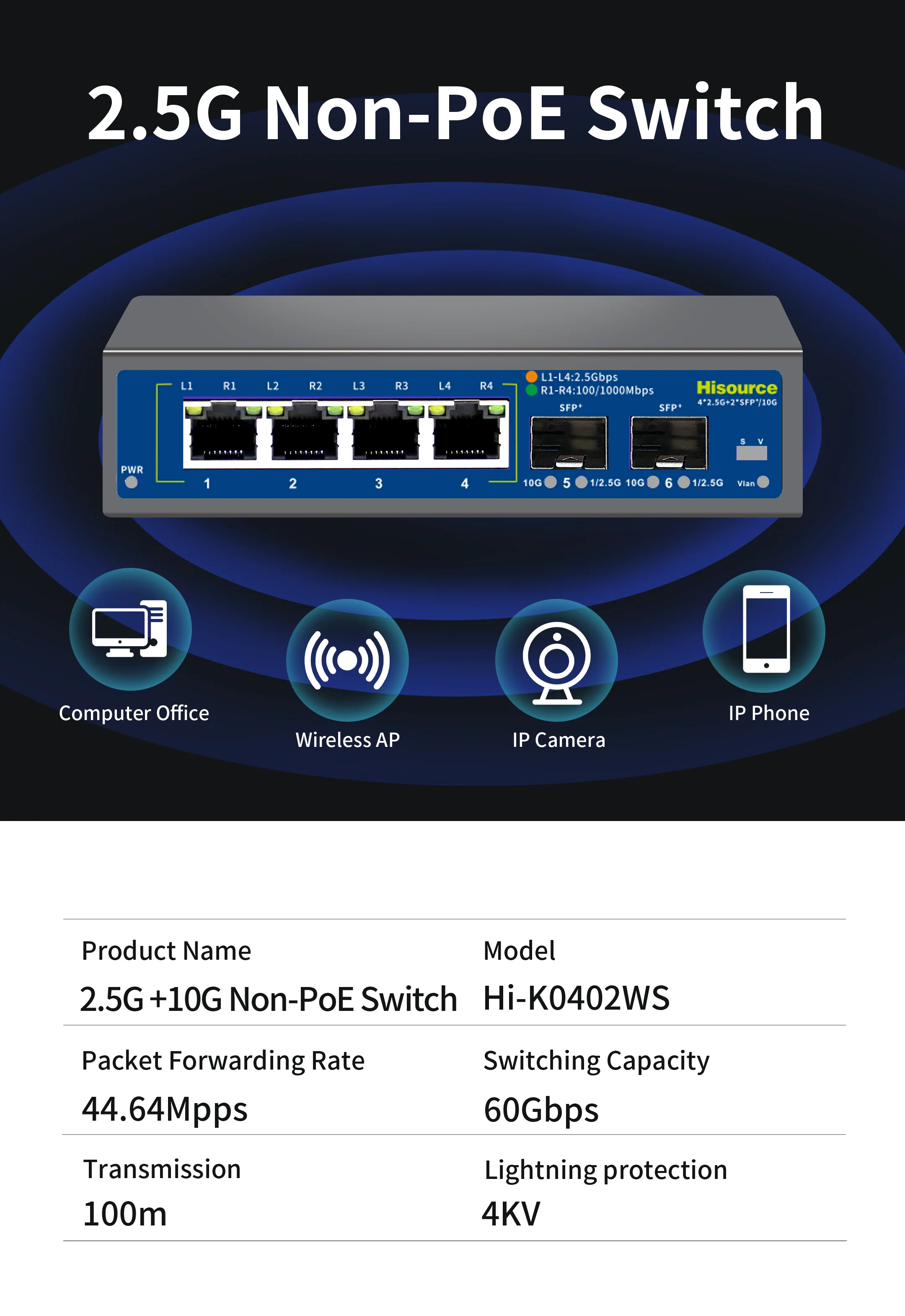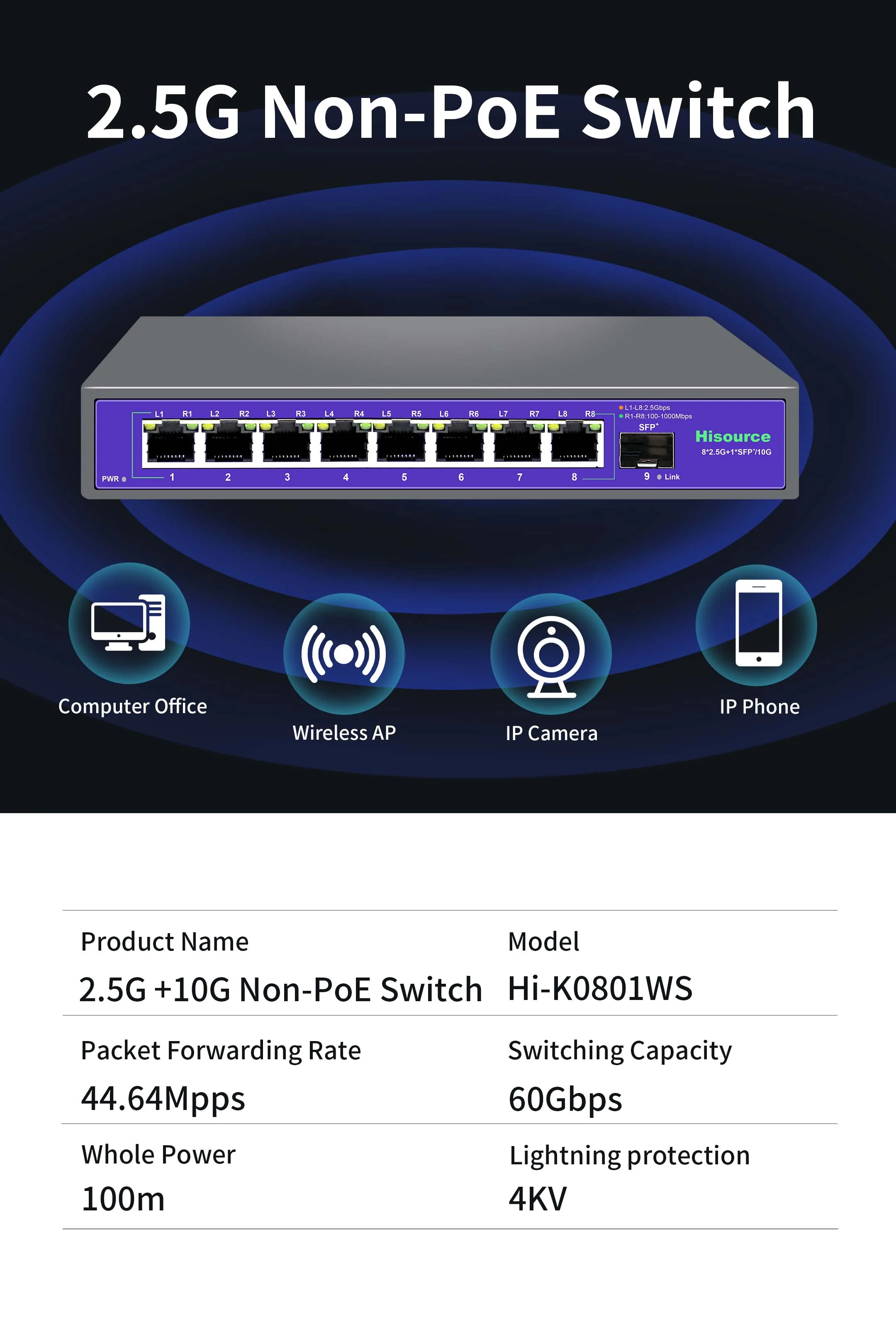 Conmutador Ethernet Hi-K0801WS, el producto proporciona 8*2.Puertos 5G, puerto óptico SFP+ 1*10Gb, que conecta varios 2.Los dispositivos 5G pueden disfrutar directamente del 2.Transmisión 5G de alta velocidad, utilizando un mecanismo de almacenamiento y reenvío, integración interna de caché de alta capacidad y reducción efectiva del retardo de reenvío de datos, todos los puertos pueden lograr un reenvío de velocidad de línea sin bloqueo.