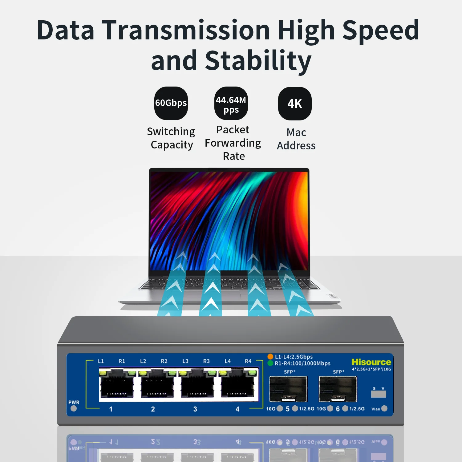 Conmutador Ethernet Hi-K0801WS, el producto proporciona 8*2.Puertos 5G, puerto óptico SFP+ 1*10Gb, que conecta varios 2.Los dispositivos 5G pueden disfrutar directamente del 2.Transmisión 5G de alta velocidad, utilizando un mecanismo de almacenamiento y reenvío, integración interna de caché de alta capacidad y reducción efectiva del retardo de reenvío de datos, todos los puertos pueden lograr un reenvío de velocidad de línea sin bloqueo.