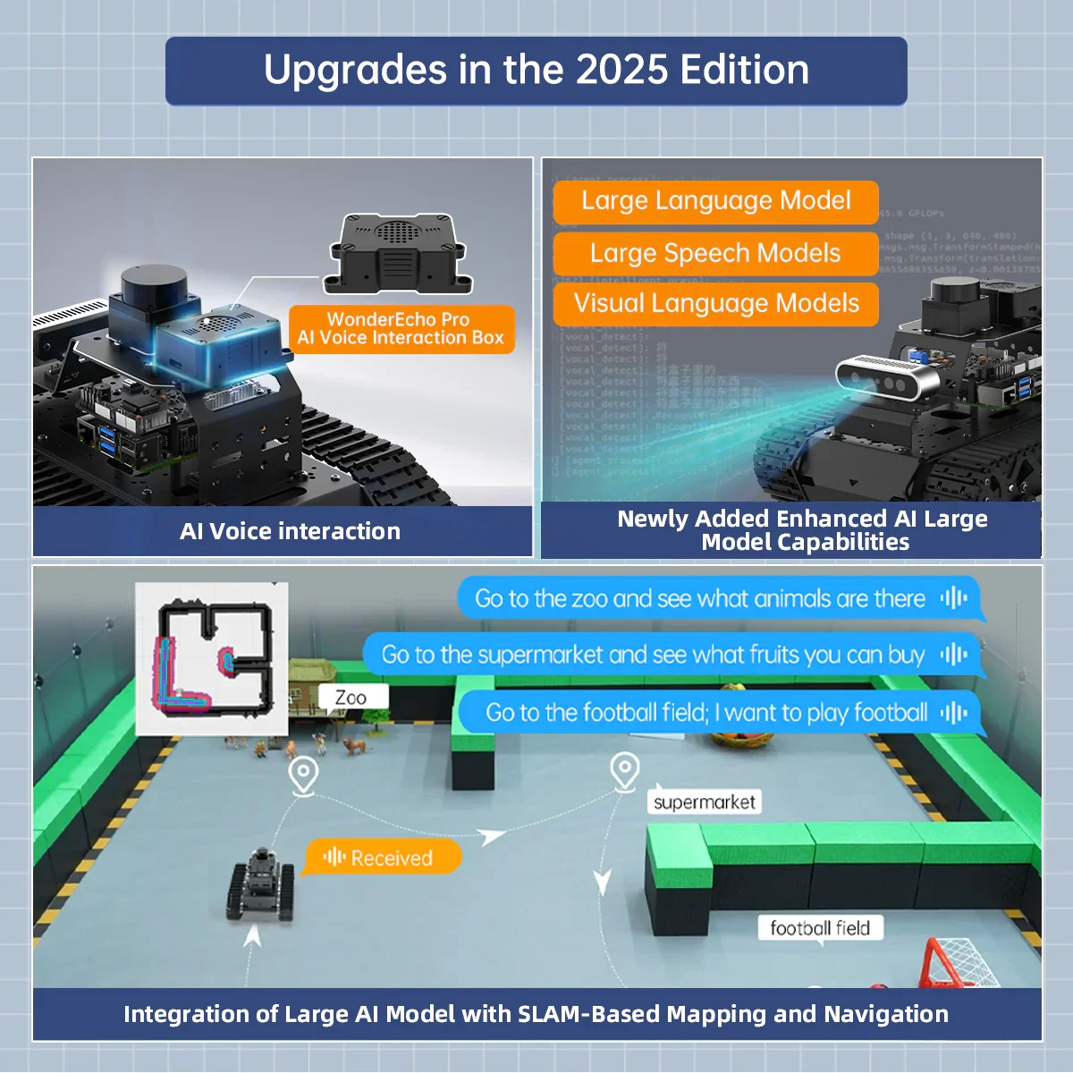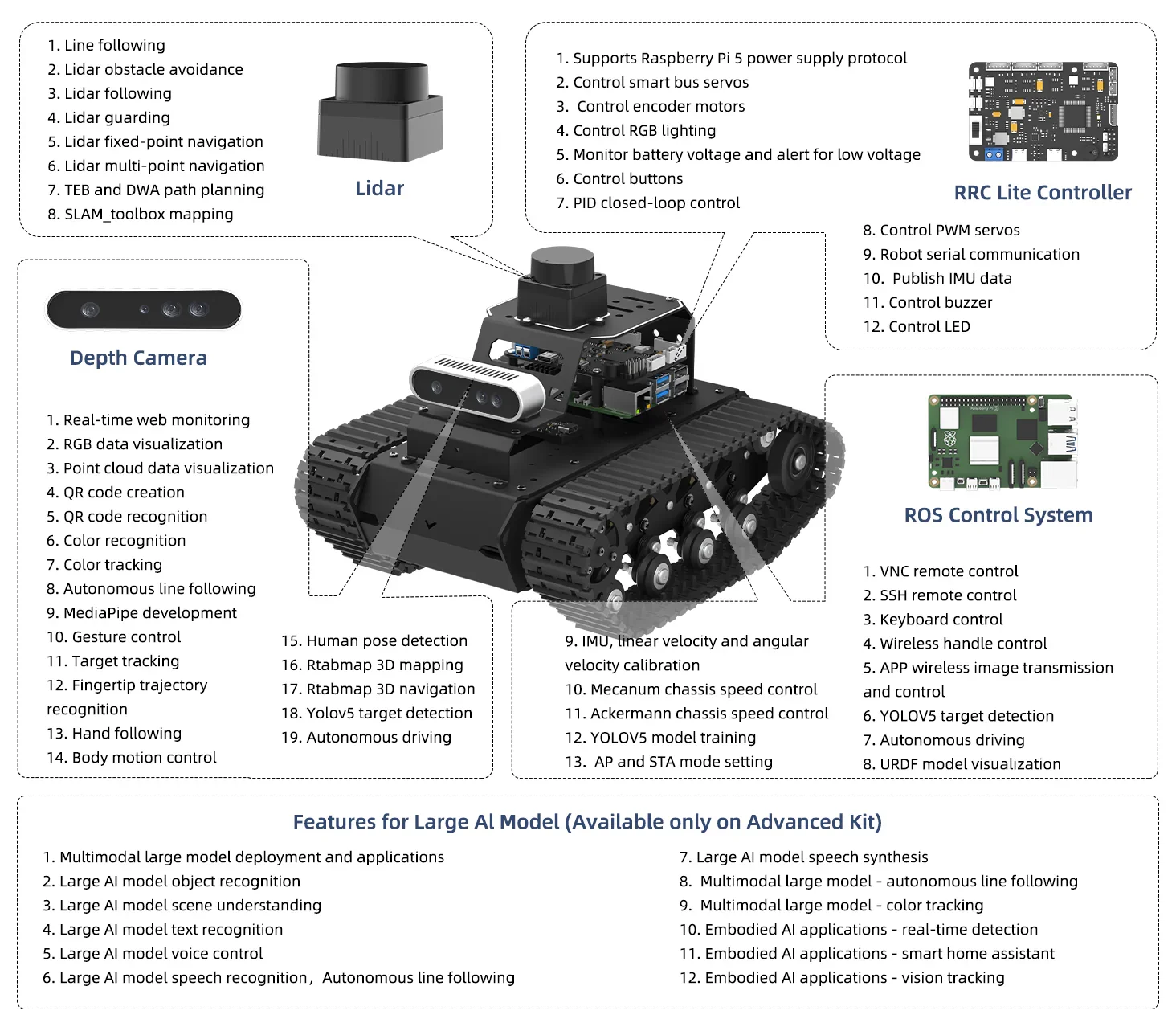 [Advanced AI Capabilities] Supports SLAM mapping, path planning, multi-robot coordination, vision recognition, target tracking, and more, covering a wide range of AI applications.