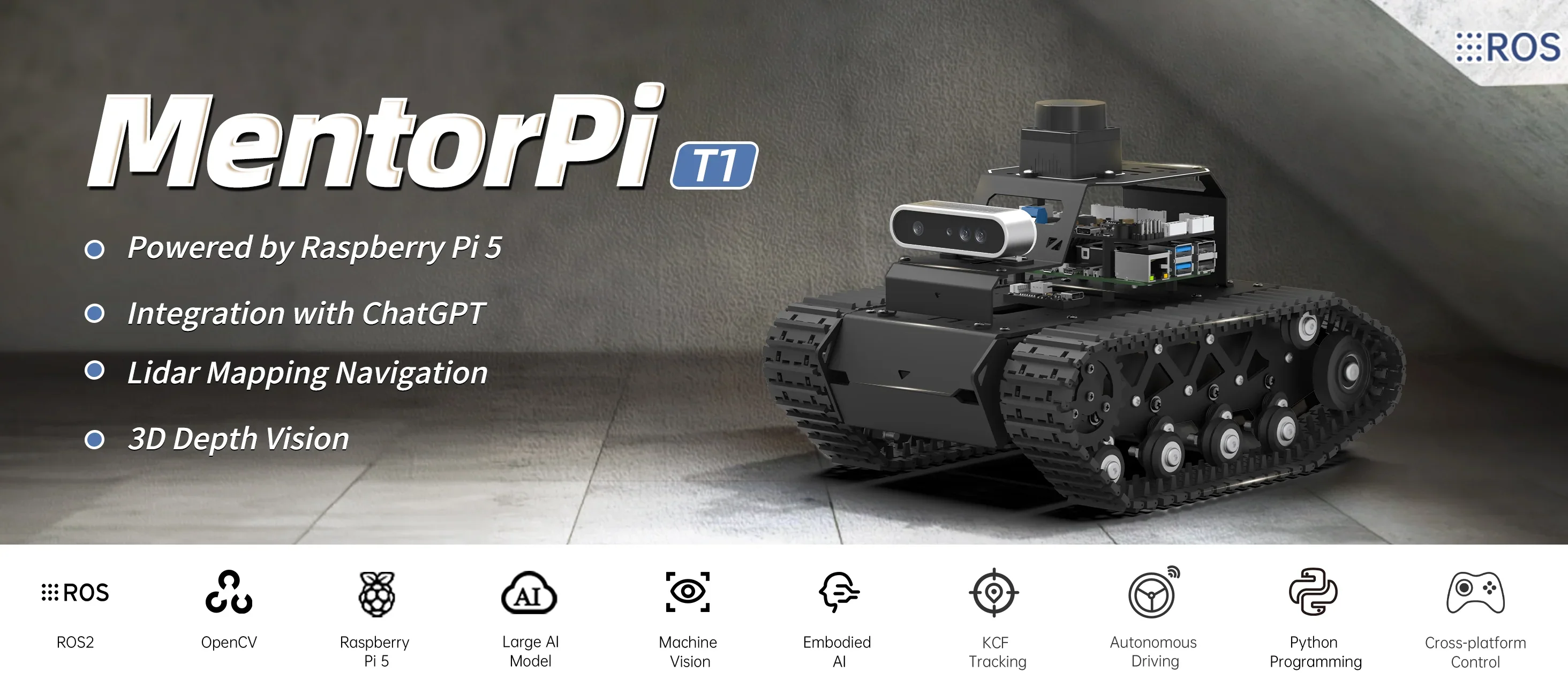[Raspberry Pi 5 & ROS2 Robot Car] MentorPi T1 is powered by Raspberry Pi 5, compatible with ROS2, and programmed in Python, making it an ideal platform for AI robot development.