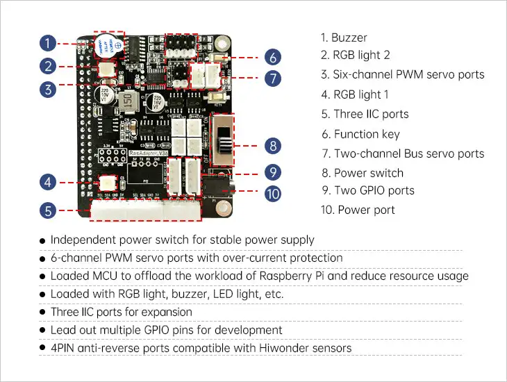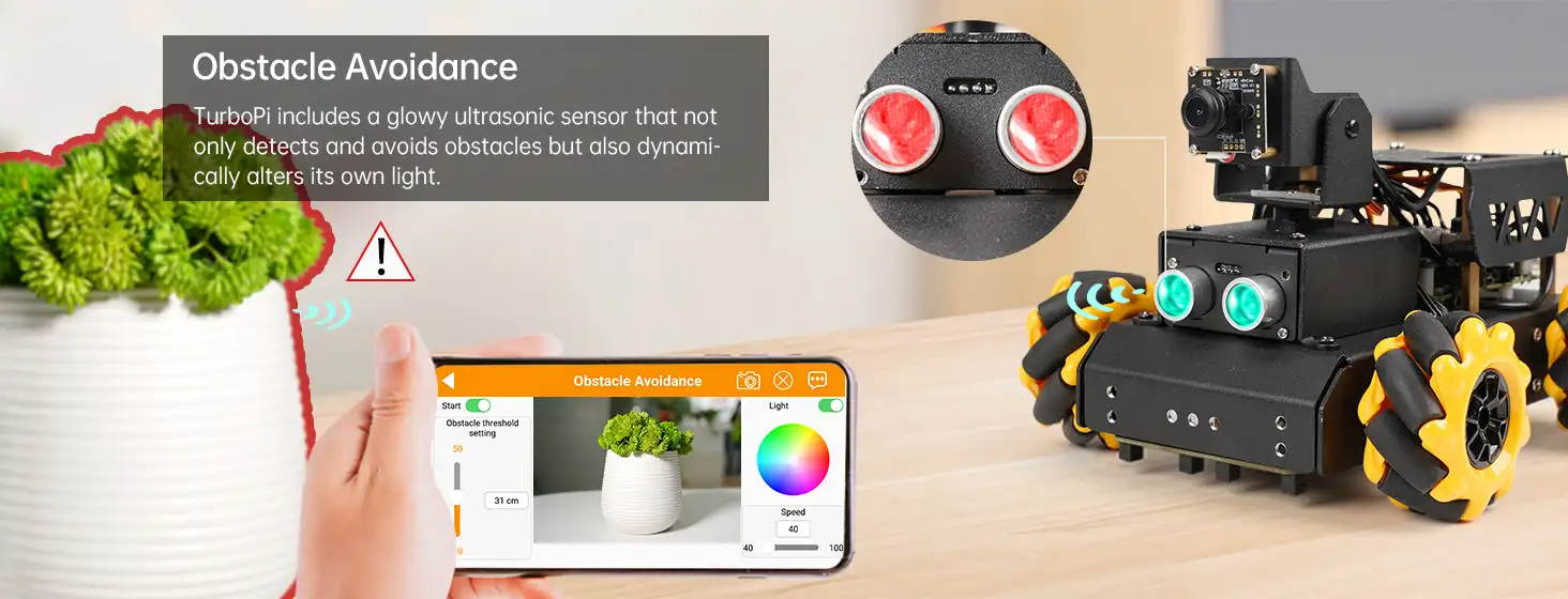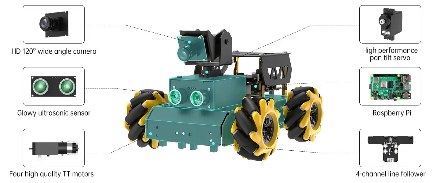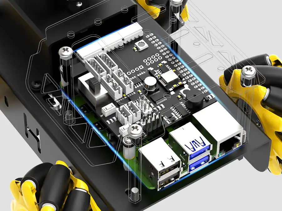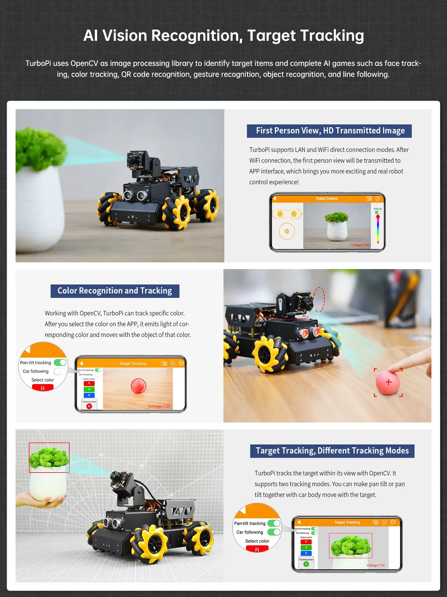 TurboPi funciona con el controlador Raspberry Pi 4B o CM4 que le permite embarcarse en proyectos de control de movimiento, visión artificial y OpenCV.