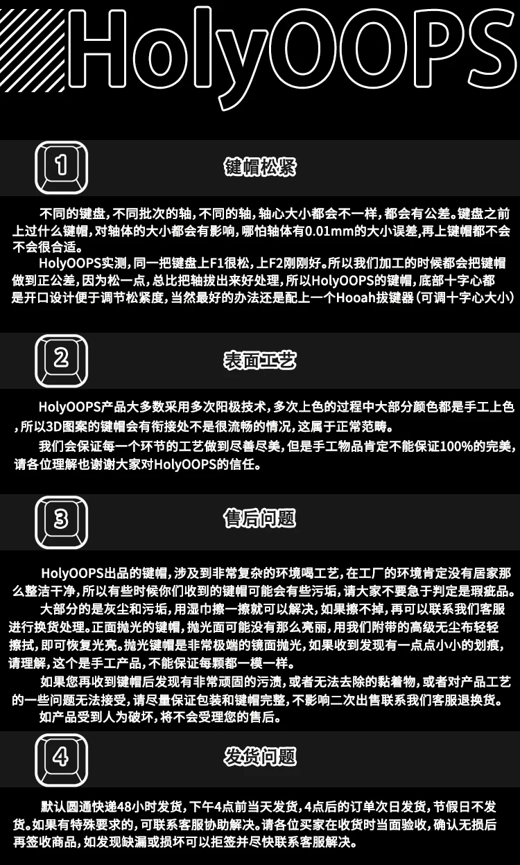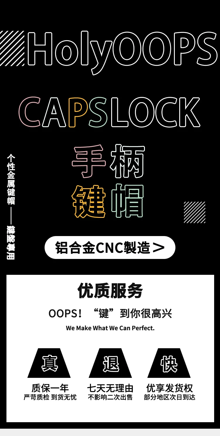 EspecificacionesVendedor: HolyoopsMaterial: Aluminio anodizado CNC KeycapCompatible con interruptores Cherry MXPor favor, preste atención: solo las teclas de Holyoops, sin incluir otras cosas.1.75u keycap, solo puede admitir Capslock o 1.75u shift :)