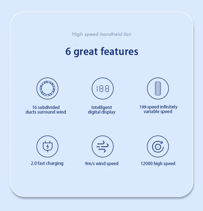 La combinación de motor trifásico sin escobillas y batería de 3500mAh mejora significativamente la velocidad del viento, la potencia y la resistencia. La velocidad máxima del viento puede alcanzar 9 m/s. La velocidad máxima de un ventilador de mano es tres veces la de un ventilador personal normal, alcanzando las 15000 revoluciones por minuto. Una carga puede enfriarse durante 3-10 horas.
