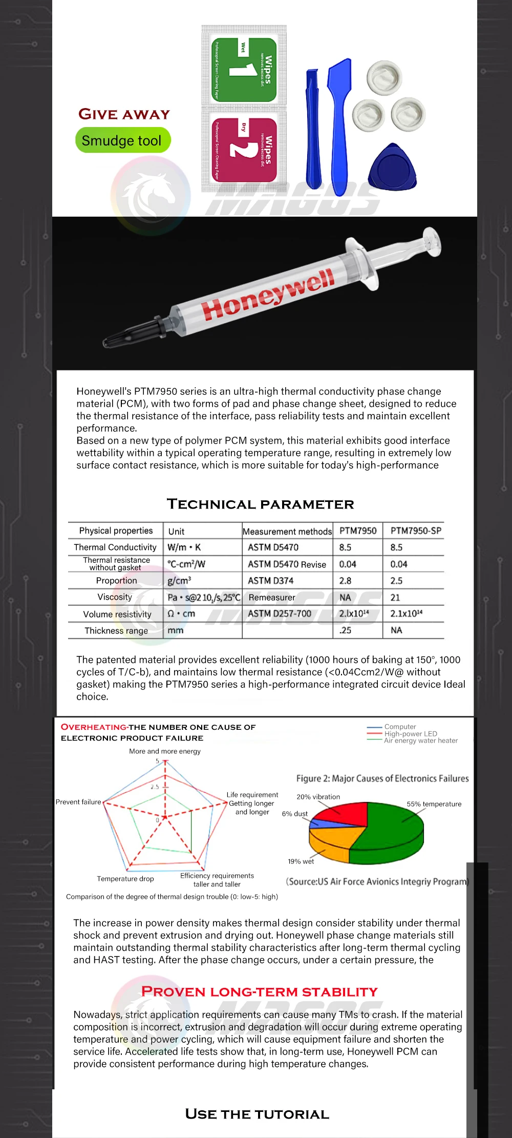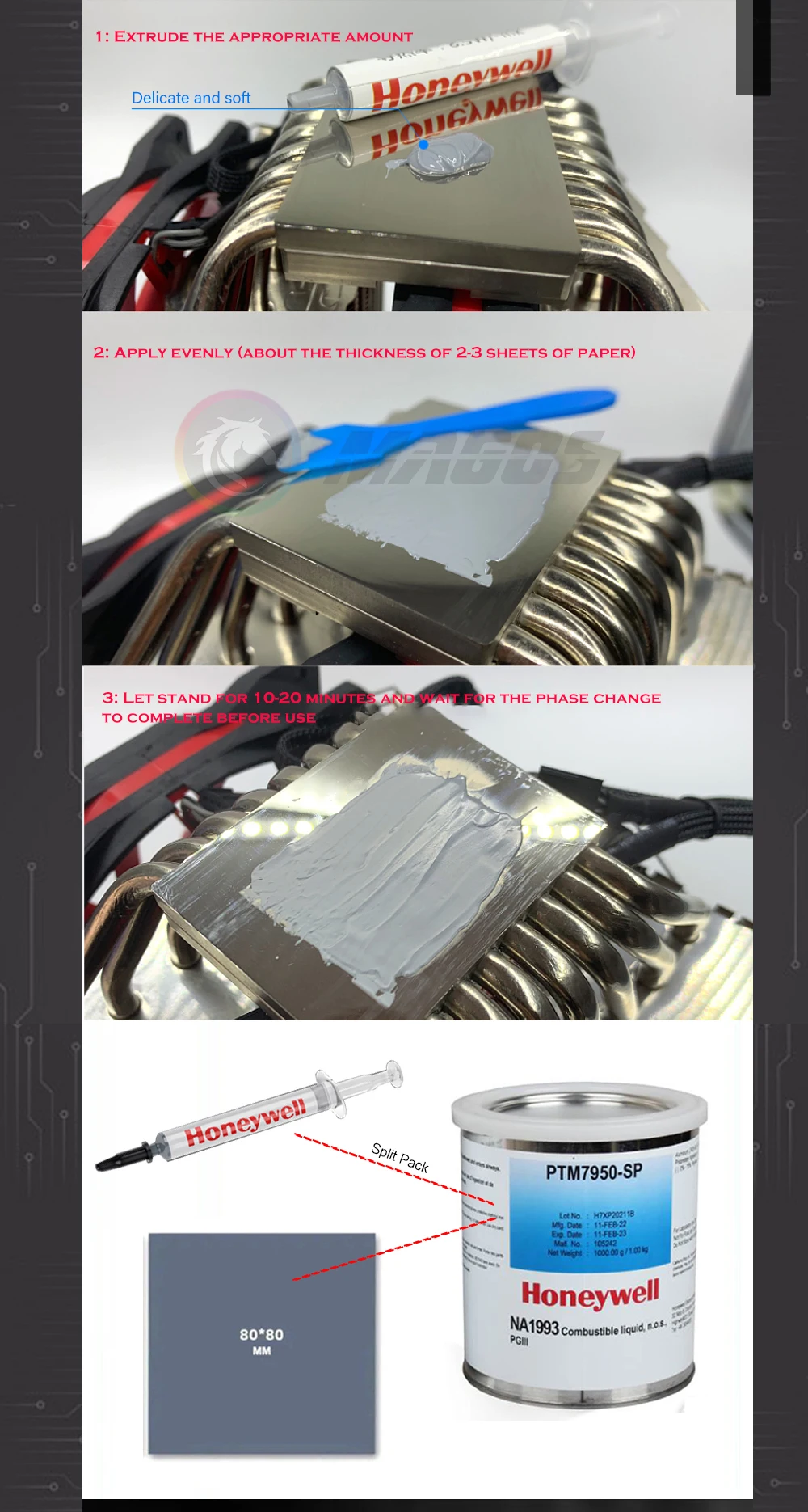 PTM7950 es un material patentado que proporciona una fiabilidad superior (pasa 150 °C horneado 1000 horas, T/1000 ciclos) y mantiene una baja impedancia térmica ( 0,04 ˚ Ccm2/W @ sin cuña), haciendo que la serie PTM7950 sea deseable para dispositivos de circuito integrado de alto rendimiento.