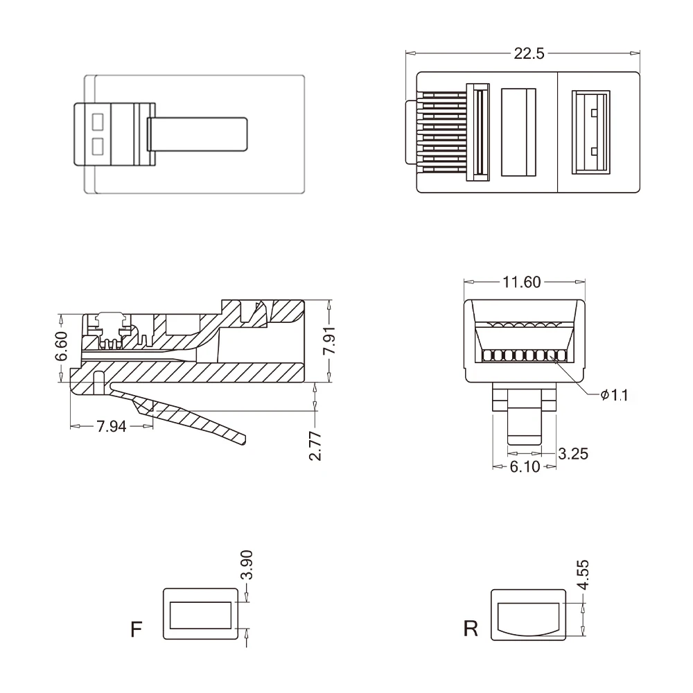 Aplicación: los conectores CAT6 tienen un diámetro de agujero de 1,1mm. Es adecuado para cable de red 23-26AWG con velocidad de transmisión de 1000Mbps