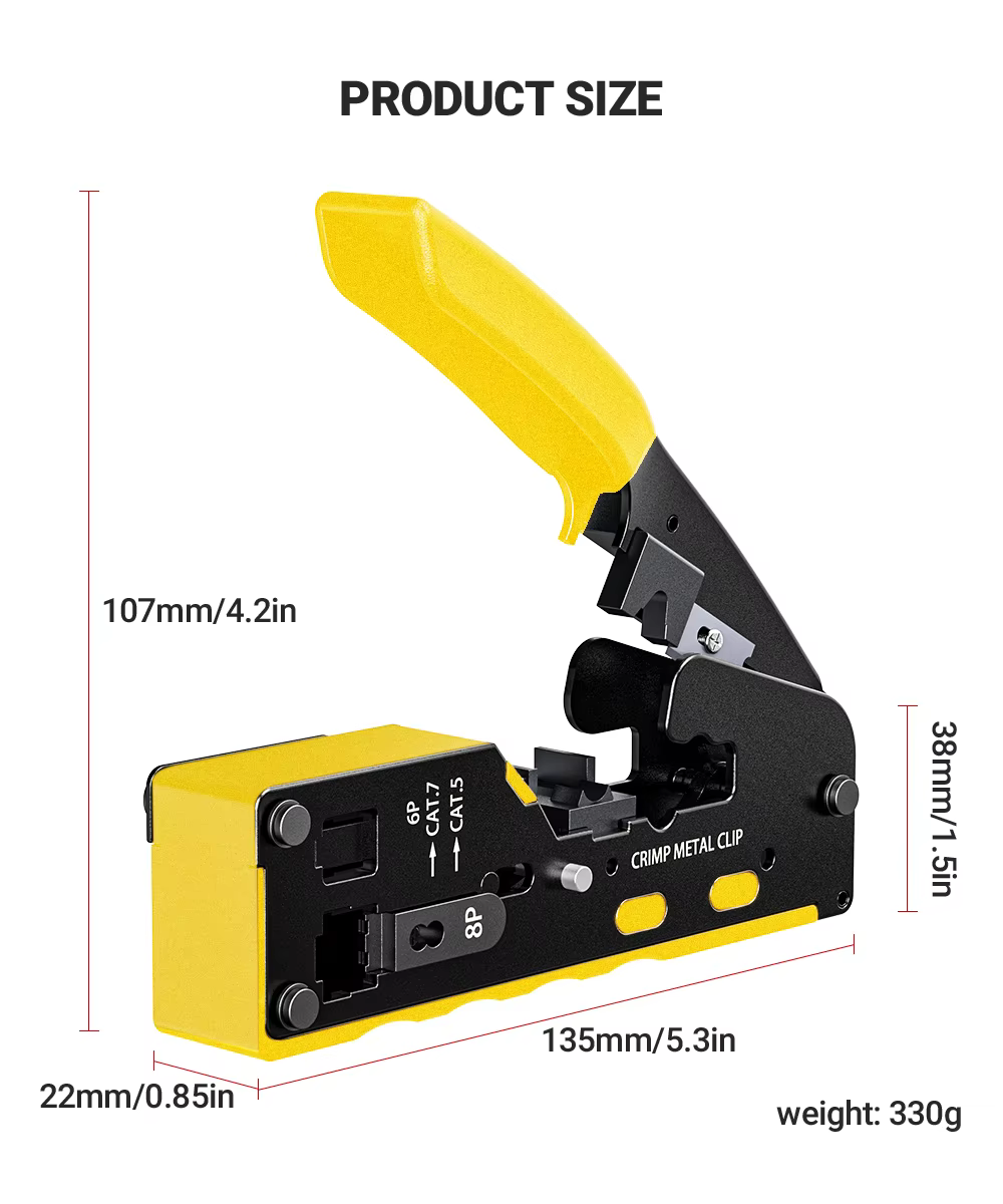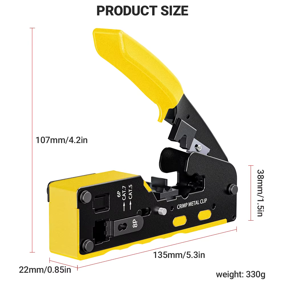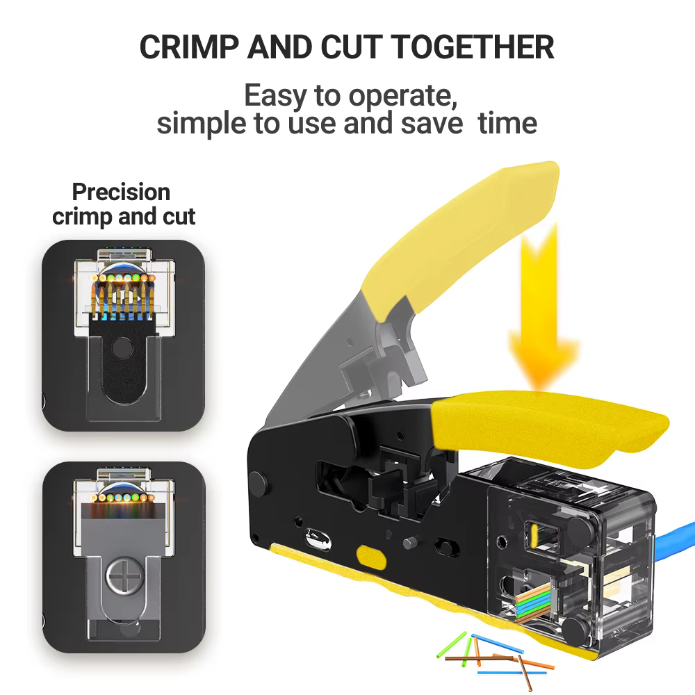 Ideal para engarzar conectores estándar con blindaje o sin blindaje Cat7/Cat6a/Cat5e/Cat5 o conectores de paso a través