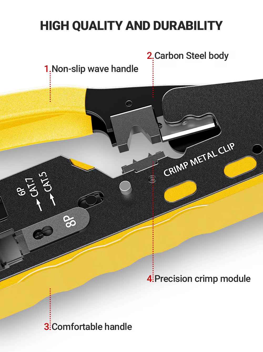 1.Compatibilidad con múltiples conectores de red: la engarzadora Hoolnx RJ45 se utiliza para engarzar conectores modulares de red 6P 8P (RJ11 y RJ45 Cat7 Cat6 Cat5 Cat5e pasando los extremos).