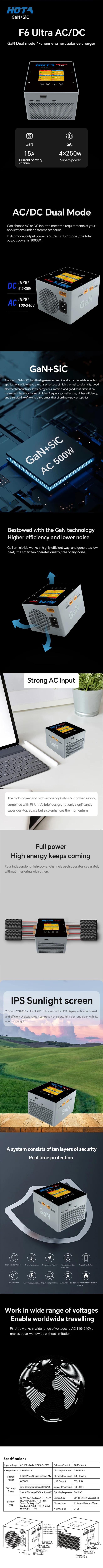 HOTA F6Ultra F6Ultra Cargador de equilibrio inteligente de 4 canales de modo dual con fuente de alimentación Batería de litio de alta potencia de 1000 W HOTA F6 +