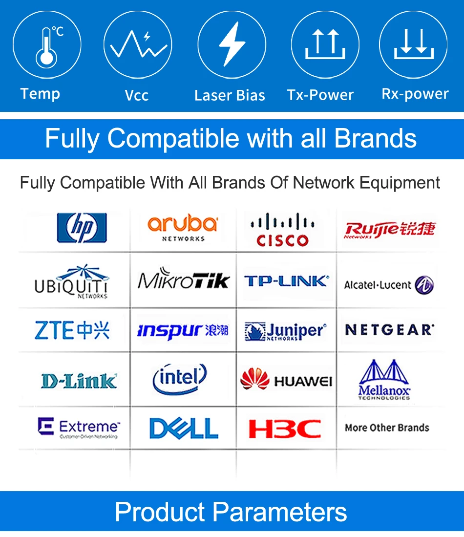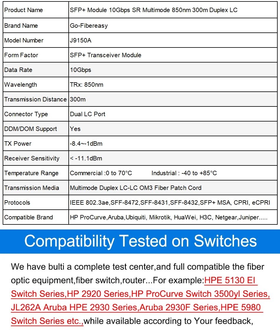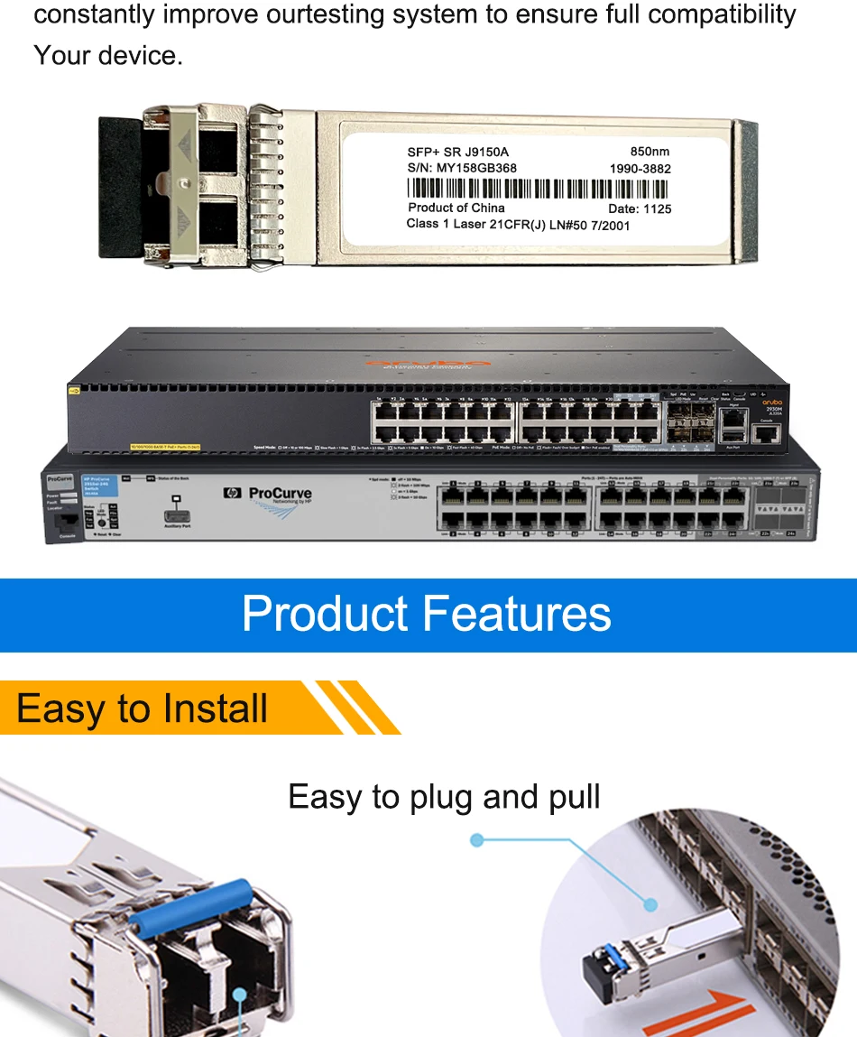 For HP J9150A/J9150D SFP 10Gb Transceiver Module 10Gbase-SR Multimode 850nm Duplex LC 300m Fiber Optical Module Compatible Aruba Ethernet Switch
