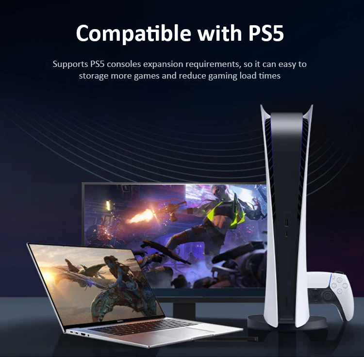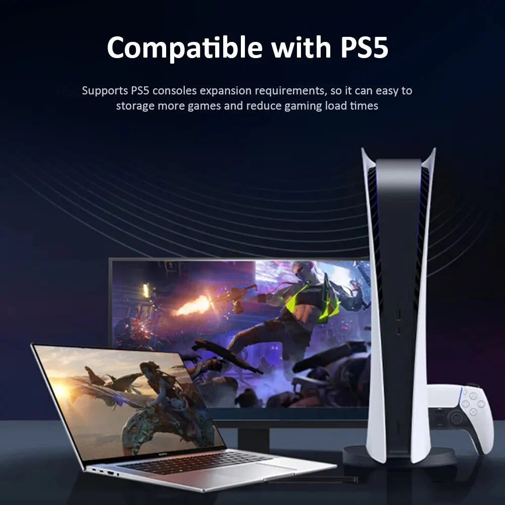 • Aplicación versátil:Perfecto para varios dispositivos, incluyendo PS5, computadoras portátiles y computadoras de bricolaje, este SSD ofrece versatilidad en el uso.