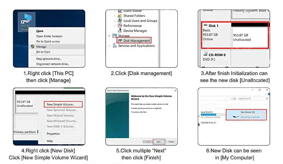 R: El nuevo SSD generalmente necesita ser formateado en Administración de discos, en Administración de discos, seleccione "y formatear Crear partición de disco duro", lo encontrará. Si aparece "No inicializado", haga clic con el botón derecho en la unidad y seleccione "Inicializar disco".