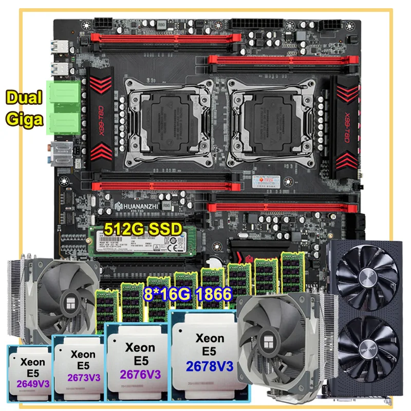 HUANANZHI-Placa base dual de 2 "+ 2678V3 + 8*16G 1866 RECC + 512G NVMe SSD + tarjeta de vídeo RX580 8G + 2 * enfriador de CPU + cable SATA + protector trasero de metal + controlador disco + manual de usuario + adaptador de enfriador de CPU