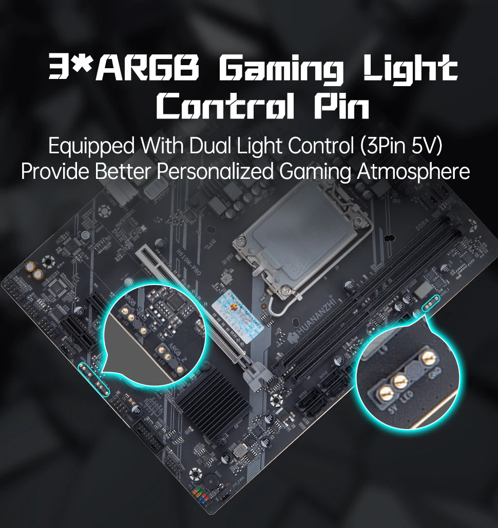 PIN DE VENTILADOR: 1xCPU_FAN PIN (velocidad ajustable),1xPWR PIN DE VENTILADOR, 2xSYS_FAN PIN (velocidad ajustable de la SYS-FAN1),3 pines ARGB de 5V (DESCARGUE el software del sitio web oficial para controlar el efecto de iluminación ARGB)