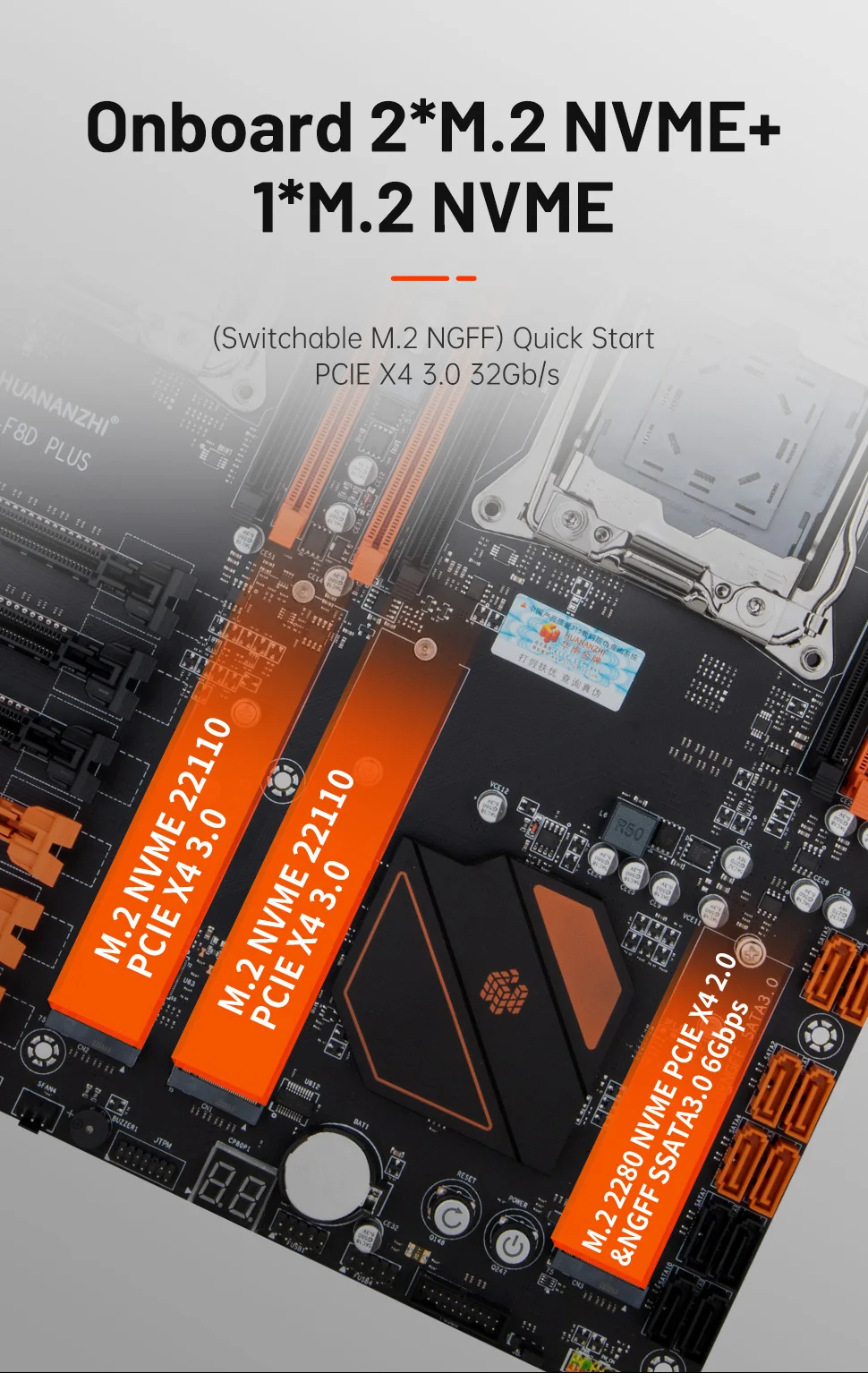Ranuras de expansión: PCI Express3.0X16 3 *, 1 * M.2 22110 NVME PCIE X4 3,0 32Gb/s,1 * M.2 2280 PCIE X4 3,0 @ NGFF SSATA 3,0 6 GB/S (se utilizará una señal ssata NGFF)