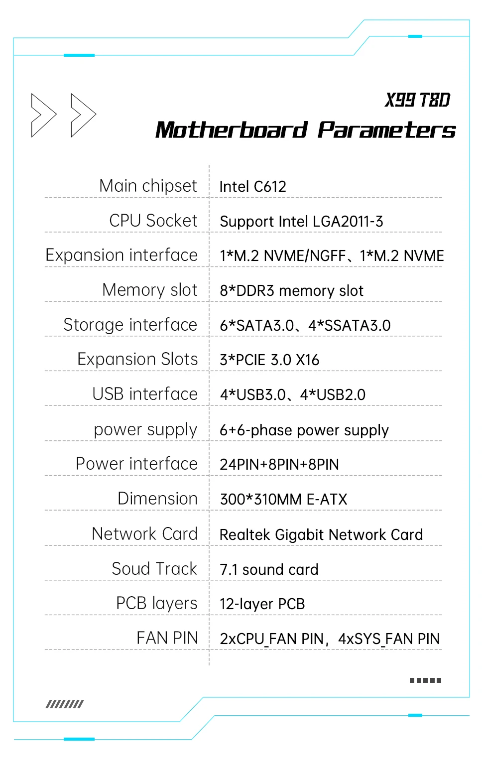 Tipo de CPU: LGA 2011/T8 / AD3 / BD3 / 8MD3 / 8M-T, "T" significa "TRES", lo que significa que la placa base UTILIZA la memoria DDR3 y solo es compatible con E5 2629V3/2649V3/2669V3/2696V3/2673V3/2676V3/2678V3, otro tipo no es compatible o no está probado