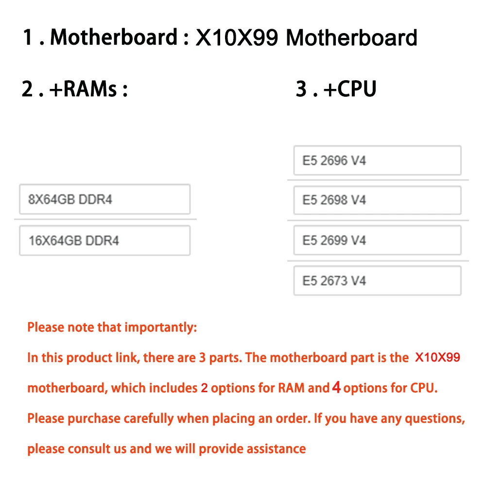 Tenga en cuenta que es importante: en este enlace de producto, hay 3 partes.La parte de la placa base es la placa base X10X99, que incluye 2 opciones de RAM y 4 opciones para CPU.Compre con cuidado al realizar un pedido.Si tiene alguna pregunta, consúltenos y le brindaremos asistencia.