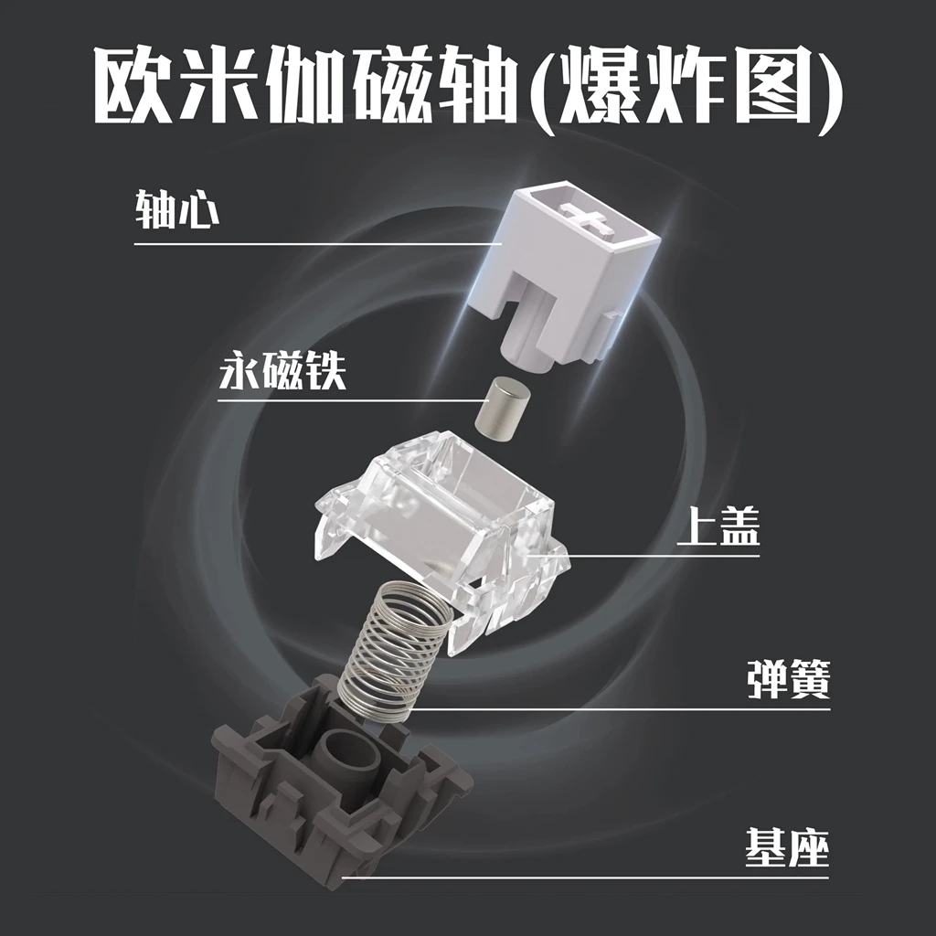 • Estructura y principio: el eje está hecho de material POM, la cubierta superior está hecha de material de PC y la carcasa inferior está hecha de material PA66.Utiliza la cooperación de bloques magnéticos y sensores Hall.Mediante el movimiento vertical de los bloques magnéticos, se cambia la distribución del campo magnético, activando el sensor Hall para lograr la función clave.Esto puede controlar con mayor precisión los cambios en el campo magnético, garantizar la precisión de la señal de disparo y reducir los disparos falsos y los disparos perdidos.