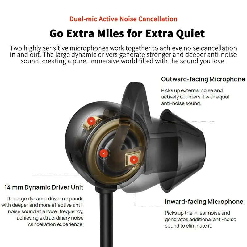 Dos micrófonos altamente sensibles trabajan juntos para lograr la cancelación de ruido dentro y fuera. Los grandes controladores dinámicos generan un sonido anti-ruido más fuerte y profundo, creando un mundo puro e inmersivo lleno del sonido que amas.