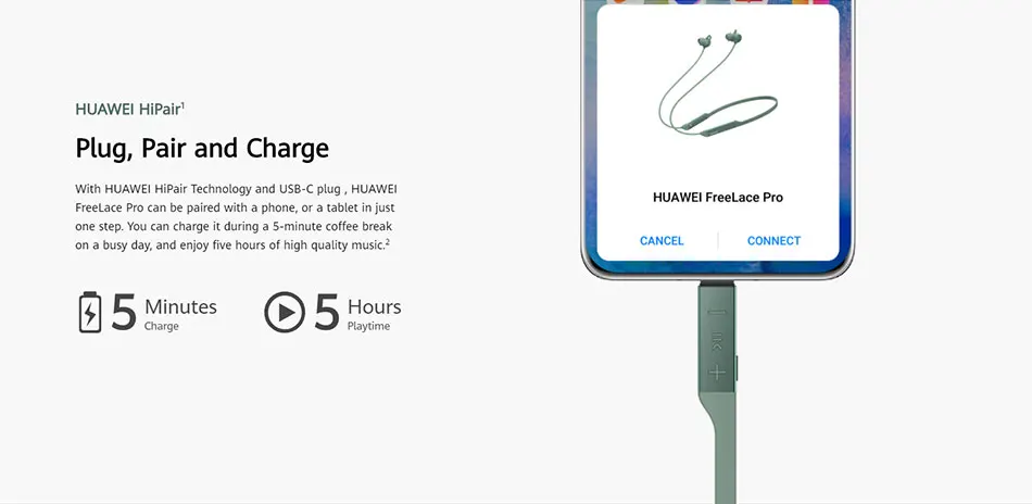 Con la tecnología HUAWEI HiPair y el enchufe USB-C, HUAWEI FreeLace Pro se puede emparejar con un teléfono, o una tableta en un solo paso.3 Puede cargarla durante una pausa de café de 5 minutos en un día ajetreado y disfrutar de cinco horas de música de alta calidad.