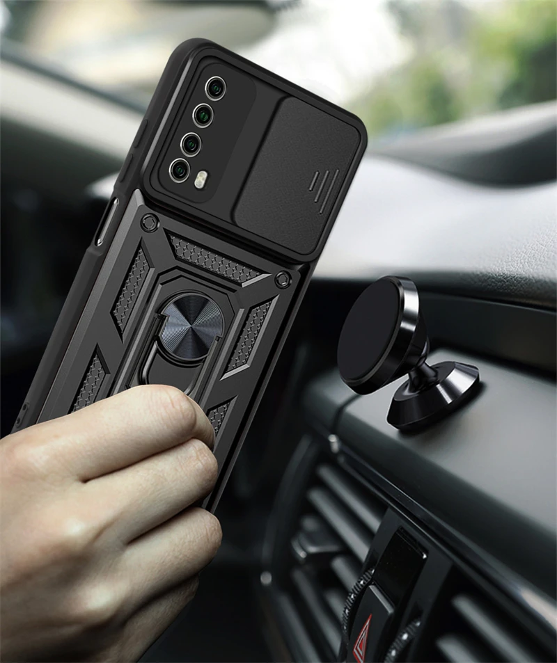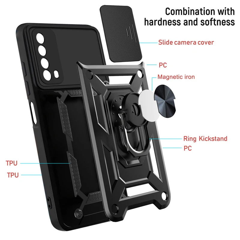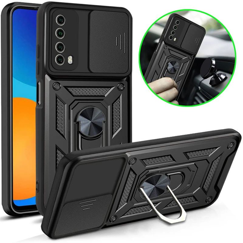 Comprar Para Huawei Y6A Y7A Y9A funda deslizante lente de cámara protege la armadura funda de teléfono para Huawei Y6P Y7P Y8P soporte magnético anillo contraportada