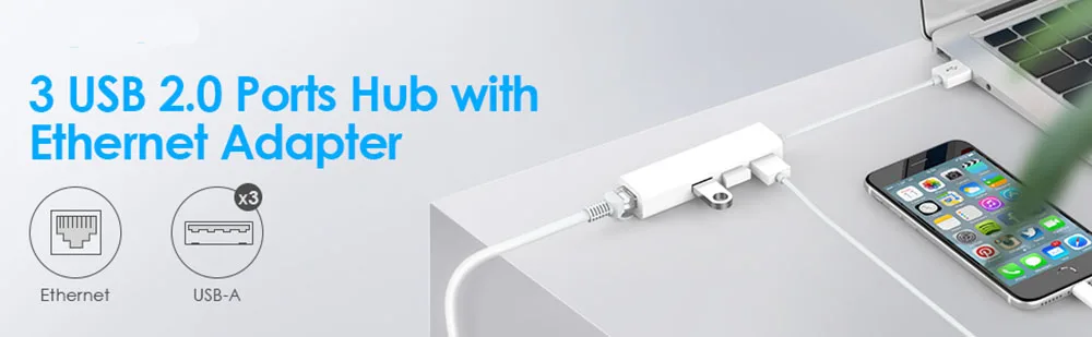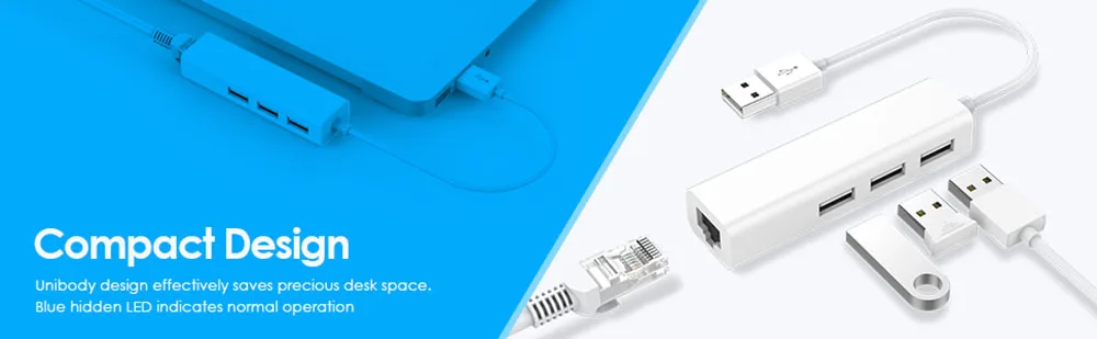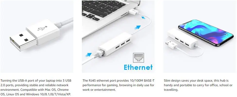 1. USB HUB with Network Adapter2. Support TCP/IP, NetBEUI, IPX/SPX3. Three receptable USB and one RJ-45 Lan Port that supports 10/100M BASE-T performance.4. Compatible for Windows 98SE/2000/ME/XP/Vista/Win7, Win8, 8.1, 10, OS X, Linux, Android system5. Support data transfer USB 2.0 High-Speed (480Mbps), Full-Speed (12Mbps) and Low-Speed (1.5Mbps)6. Premium quality & luxury material & high speed and stable data sync & nice shapePackage includes:1 *3 Ports USB HUB With USB LAN Driver