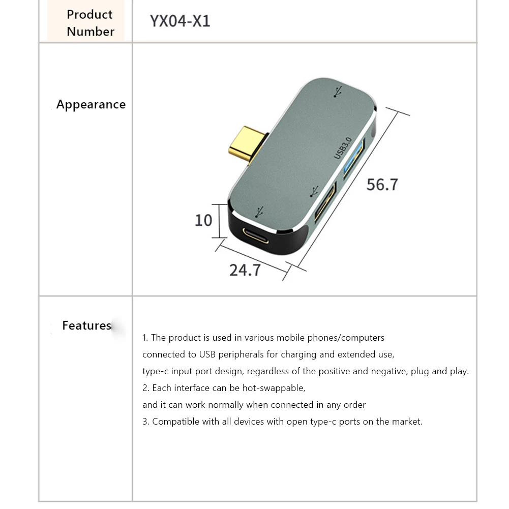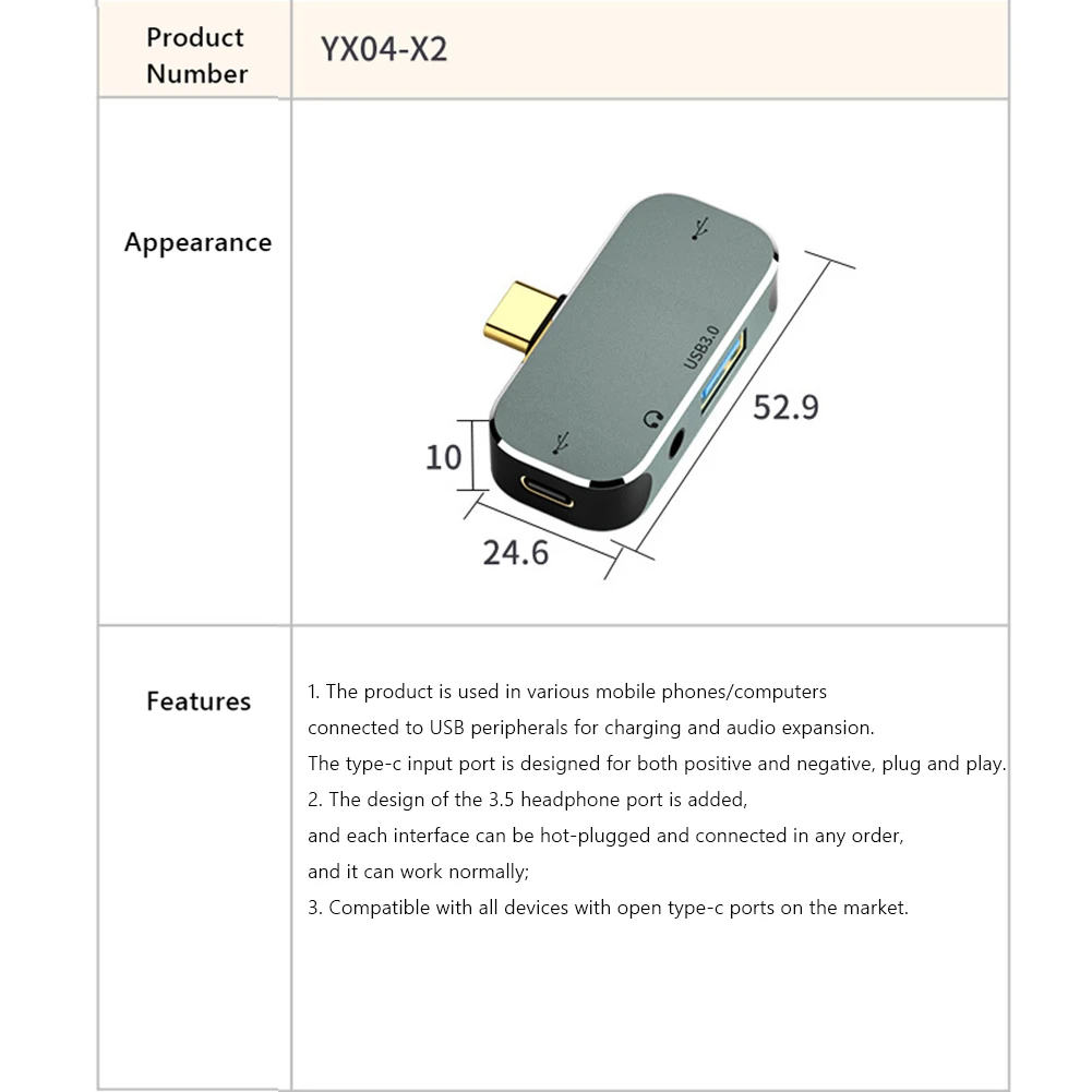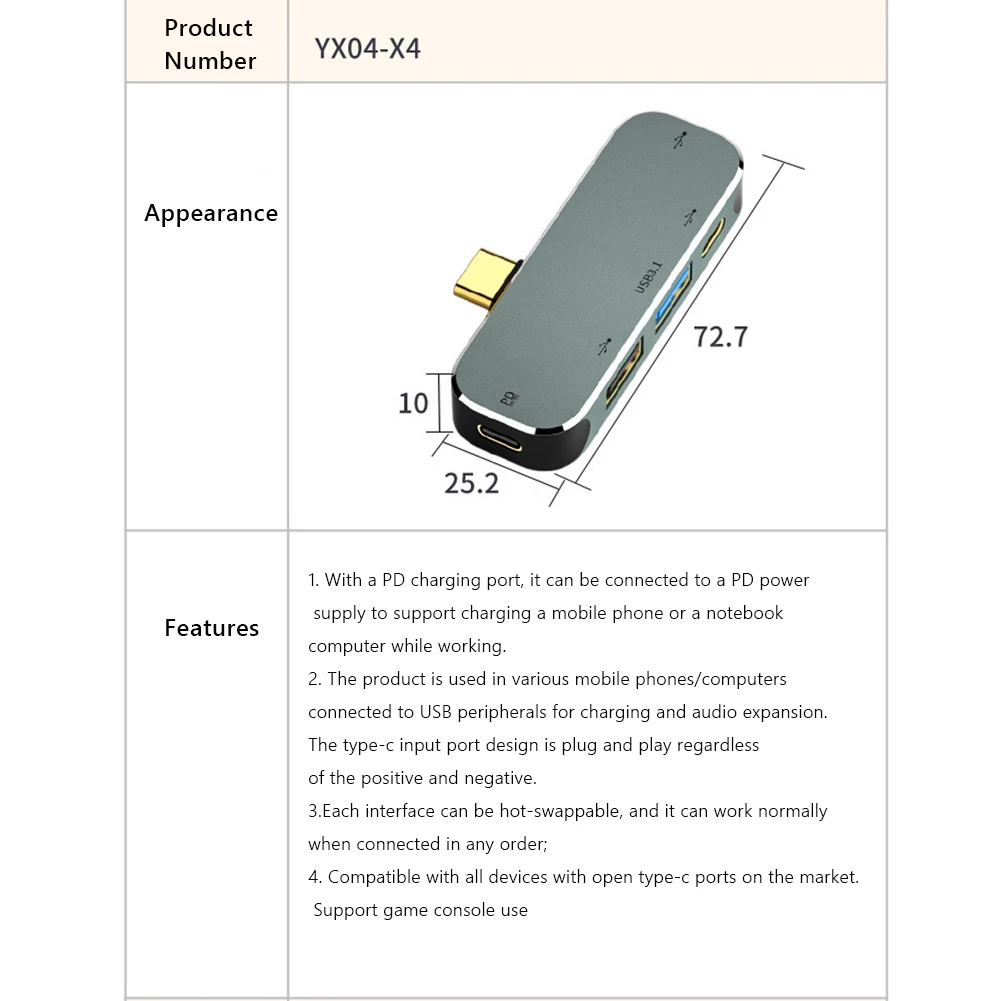 Extensión tipo C Hub 3,55mm Jack PD100W USB3.0/USB2.0/USB3.1 HDMI Compatible con USB extensor PC ordenador portátil divisor accesorio Característica: Expansión de múltiples puertos, más de un lado maravilloso. Deshazte del problema de la interfaz única del portátil delgado y ligero, y conecta más dispositivos: disco flash USB, teclado, ratón, disco duro móvil, ventilador pequeño USB, impresora, etc. Orificio para auriculares de 3,55mm, cómodo para escuchar música y cargar. Interfaz de audio de 3,55mm, admite efecto de sonido estéreo, conecta auriculares/audio, etc., y garantiza la combinación correcta de oficina y entretenimiento (YX-X2, YX-X3, YX-X5 compatible con esta función) Carga rápida PD100W, con puerto de carga PD conecte la fuente de alimentación PD para cargar el teléfono móvil o el ordenador portátil mientras está en funcionamiento, y admite protocolo de carga rápida PD3.0, potencia de carga de hasta 100W, compatible con la consola de juegos NS, y todas las interfaces se pueden conectar en caliente (YX-X3, YX-X4, YX-X5 esta función) Con interfaz USB3.0/interfaz USB2 0, que puede conectar varios dispositivos USB al mismo tiempo. USB 2,0: velocidad 480mbps, compatible con USB 1,1, potencia de salida 5V / 500mA; USB 3,0: la velocidad admite hasta 5Gbps, los archivos de 1GB se transmiten en 3 segundos. Compatible con USB 2,0/1,1, potencia de salida 5V / 900mA; Tipo C: USB2. 0 480mbps de transmisión de potencia máxima de salida de 5V / 1.5A Proyección de conferencia Compatible con HDMI, oficina compartida por varias personas. Pantalla dual 4KHD, conectada a proyectores, televisores, monitores y otras pantallas grandes para una oficina más eficiente. (solo YX-X5 tiene esta función) El producto es aplicable a varias conexiones de teléfonos móviles/computadoras, carga periférica USB y expansión de audio. El puerto de entrada tipo C está diseñado para enchufar y usar independientemente del positivo y negativo. Altamente compatible Para la consola de juegos NS/Apple / Android / iPad/ordenador se puede utilizar. Compatible con todos los dispositivos con puertos tipo C abiertos del mercado Especificación: Modelo del producto: YX04-X1, X2, X3, X4, X5 (opcional) Color del producto: plata Producto: YX-X1: 1xUSB3 0/1x tipo-C (2,0)/2xUSB2 0 YX-X2: 1xUSB3 0/1x tipo-C (2,0)/1xUSB2 0/1x3,5 Jack de Audio YX-X3: 1xUSB3 1/1x tipo-C (2,0)/1xUSB2 0/1x3,5 Jack de Audio/1xPD YX-X4: 1xUSB3 0/1x tipo-C (2,0)/2xUSB2 0/1xPD ¡YX-X5: 1xHDMI-Compatible/1xUSB3! 1/1xUSB2 0/1x3,5 Jack de Audio/1xPD Potencia del producto: 100W Material del producto: PVC + carcasa de aleación de aluminio Sistemas de soporte: para Windows, para Android, para MacOS Peso del producto: 15g ProductoTamaño: 63x24mm Tamaño del producto: como se muestraNota: Debido a la diferencia del monitor y efecto de la luz, el color real del artículo puede ser ligeramente diferente al color mostrado en las imágenes. ¡Gracias! Permita una desviación de medición de 1-2cm debido a la medición manual. ![]() ![]() ![]() ![]() ![]() ![]() ![]() ![]() ![]() ![]() ![]() ![]() ![]() ![]() ![]() ![]() ![]() ![]() ![]() ![]() ![]() ![]() ![]() ![]() ![]() ![]() ![]() ![]() ![]()