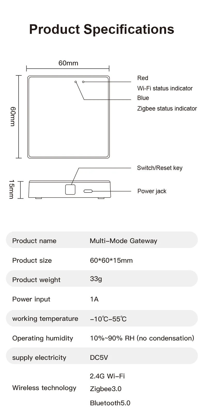 • Multi modo ZigBee Bluetooth :Con su modo multi ZigBee Bluetooth, este gateway ofrece una conectividad versátil y estable para tus dispositivos inteligentes.