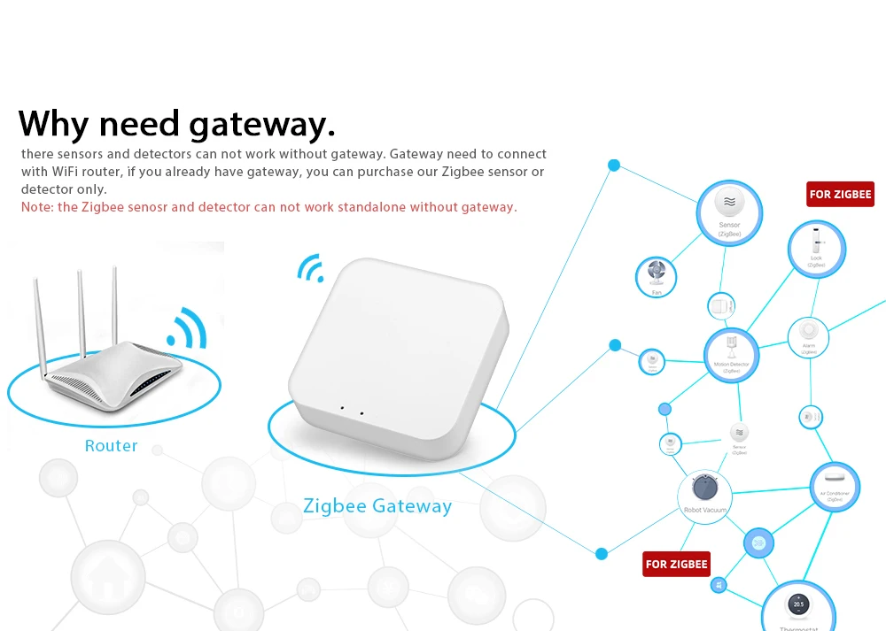 Los sensores y detectores no pueden funcionar sin una puerta de enlace. La puerta de enlace necesita conectarse con el enrutador-FI, si ya tiene una puerta de enlace, puede comprar solo nuestros sensores o detectores.
