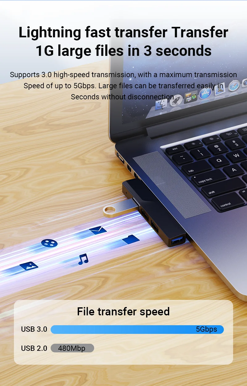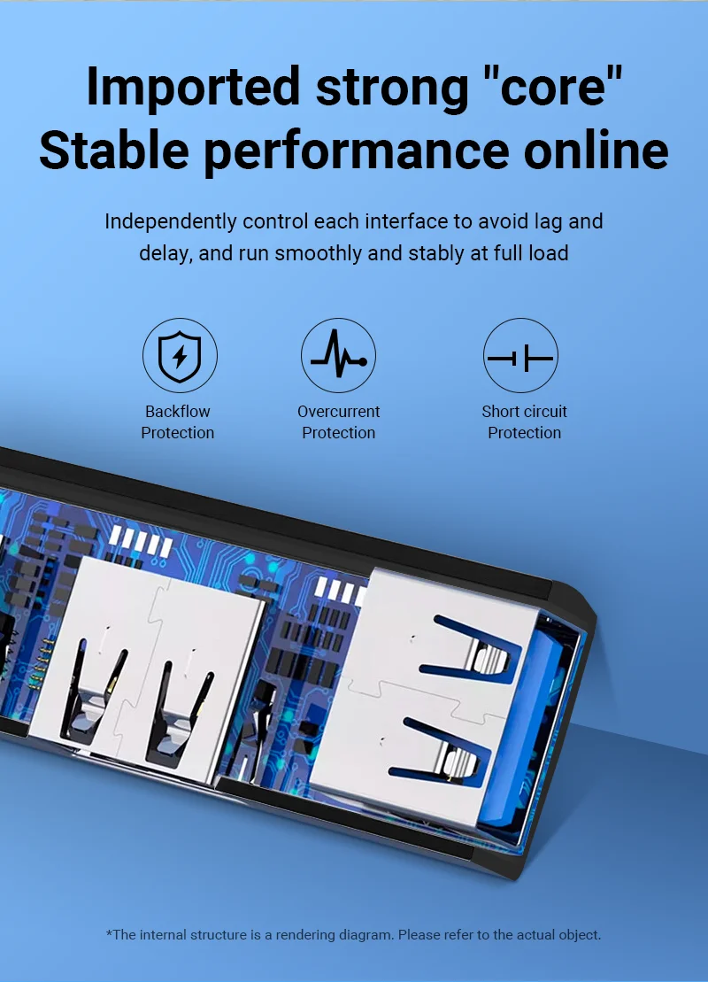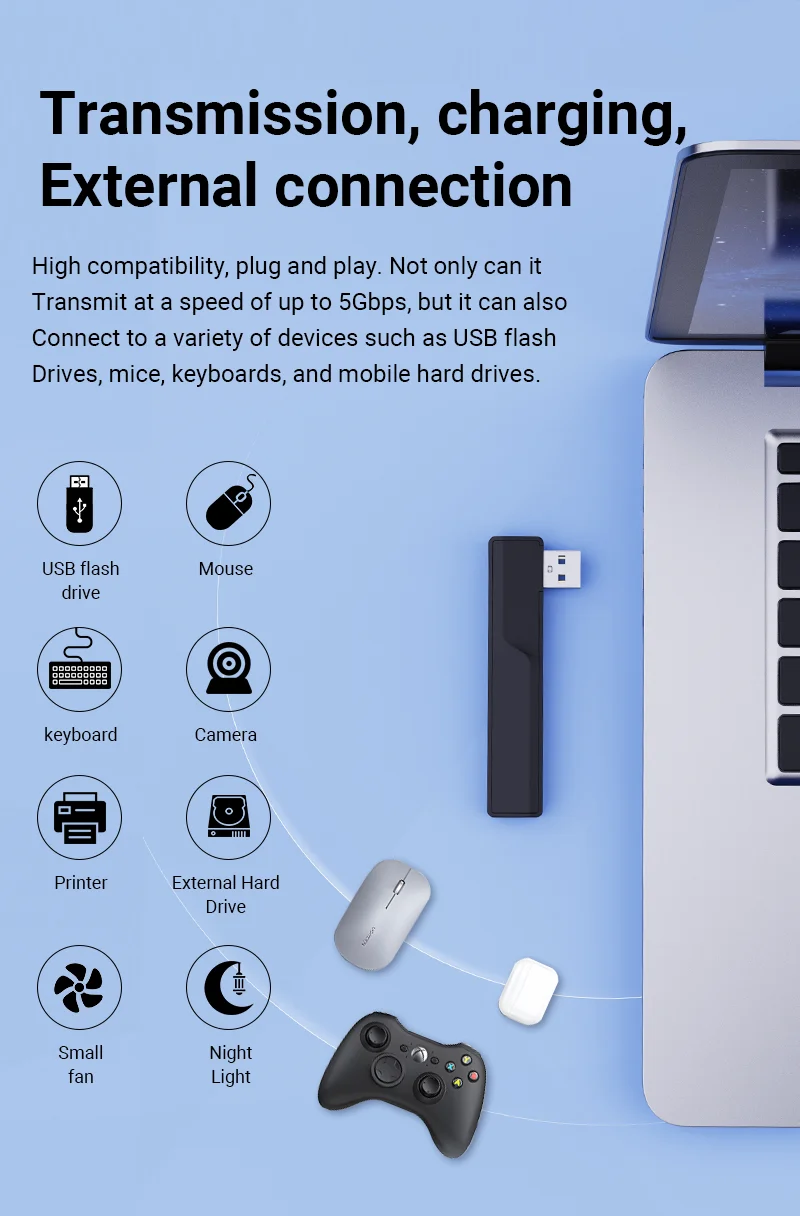 Hub de datos de alta velocidad: el concentrador USB 3.0 le proporciona una conexión estable y consistente con una velocidad de transferencia de datos de hasta 5 Gbps, que es 10 veces más rápida que el USB 2.0, lo suficientemente rápida como para transferir una película HD en segundos
