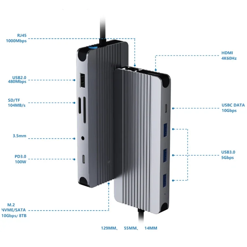 12 EN 1: M.2 SATA y NVME (10 Gbps/8 TB) + RJ45 (1000 Mbps) + USB 2.0 (480 Mbps) + SD/TF (104 MB/s) + 3,5 mm + PD3.0 (100 W) + HDMI (4 K60 Hz) + DATOS USB C (10 Gbps) + USB 3.0 (5 Gbps) * 3