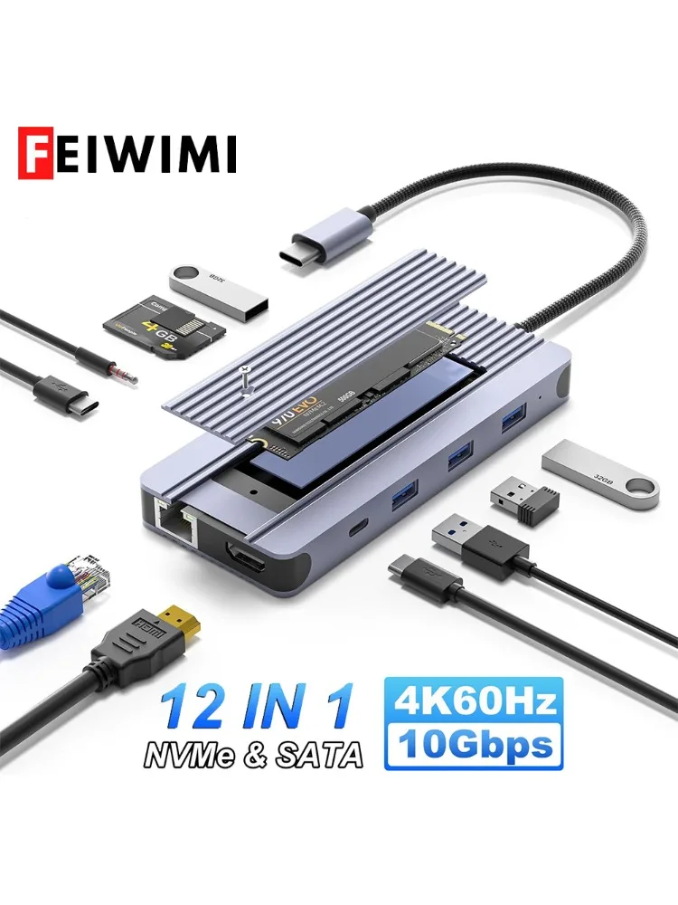 【HUB USB C de expansión todo en uno】Actualice su dispositivo con el versátil concentrador USB C 12 en 1 de FEIWIMI, que cuenta con un M de 10 Gbps.2 carcasas de disco duro SSD NVMe/SATA, 4K@60Hz HDMI, 3 5Gbps USB 3.0 puertos, 5 Gbps USB-C DATOS, USB 2.0, 48 kHz 3.Conector de audio de 5 mm, lector de tarjetas SD/TF, Ethernet RJ45 de 1 Gbps y puerto de carga USB C PD con suministro de energía de 100 W para crear una solución todo en uno perfecta para su conectividad perfecta.