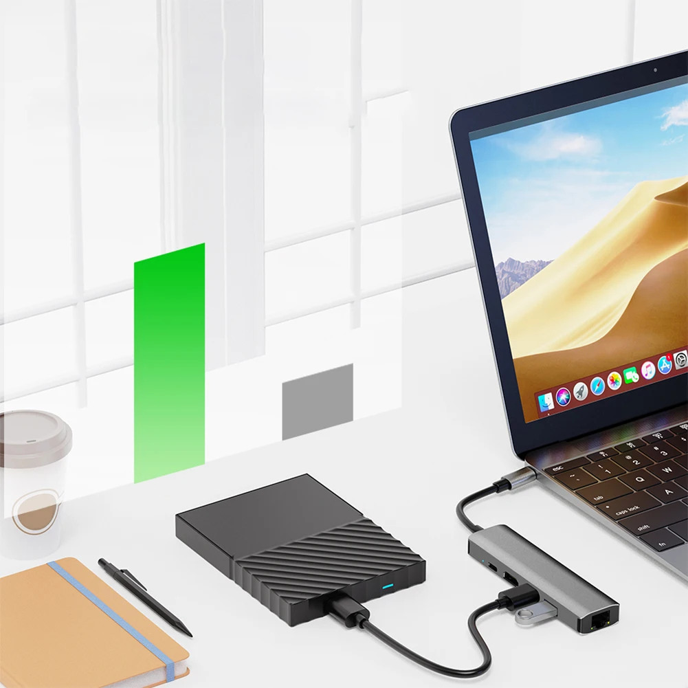 2.Transferencia de alta velocidad de 5 Gbps:El USB C Dongle cuenta con un puerto USB 3.0 que admite velocidades de transferencia de datos de hasta 5 Gbps.Transfiera archivos, vídeos e imágenes grandes sin esfuerzo en segundos, mejorando su productividad.