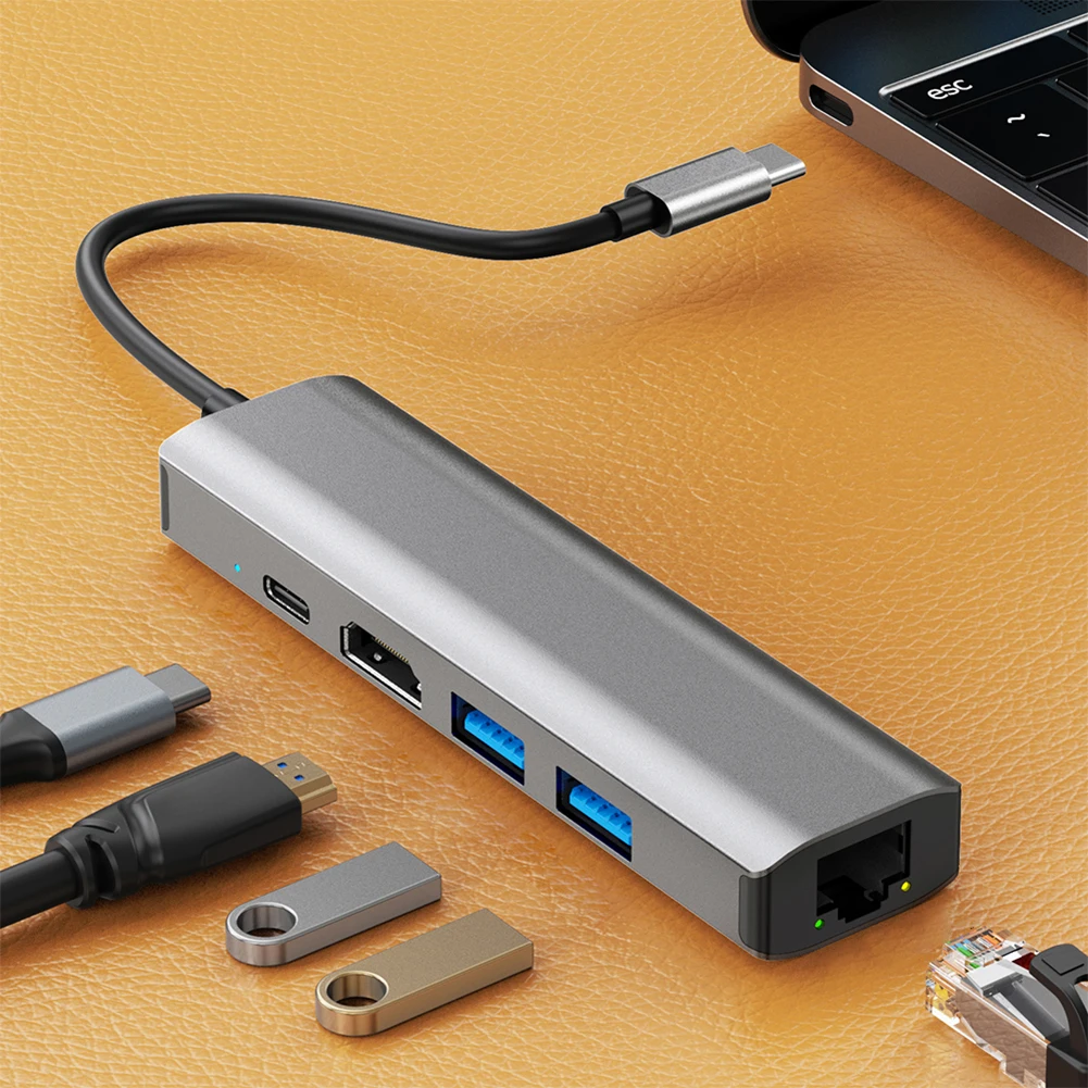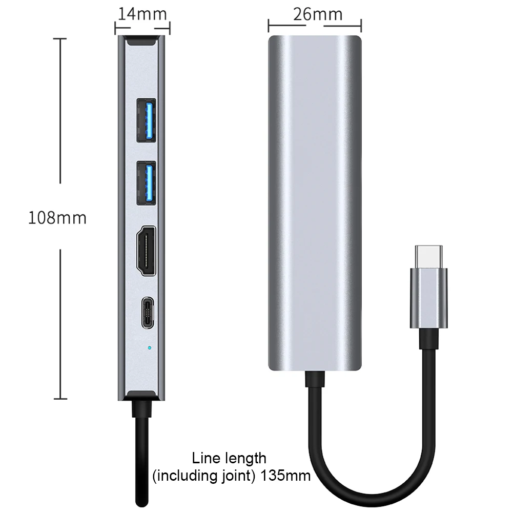 Característica:1.Expansión multifuncional 5 en 1:El concentrador USB C ofrece una gama robusta de puertos, incluidos 1 PD100W/USB-C, 1 4K/30Hz compatible con HDMI, 1 USB 3.0, 1 USB 2.0 y 1 puerto Ethernet.Este adaptador multipuerto le permite acceder a Internet rápido, conectar periféricos y completar sus tareas de manera eficiente.
