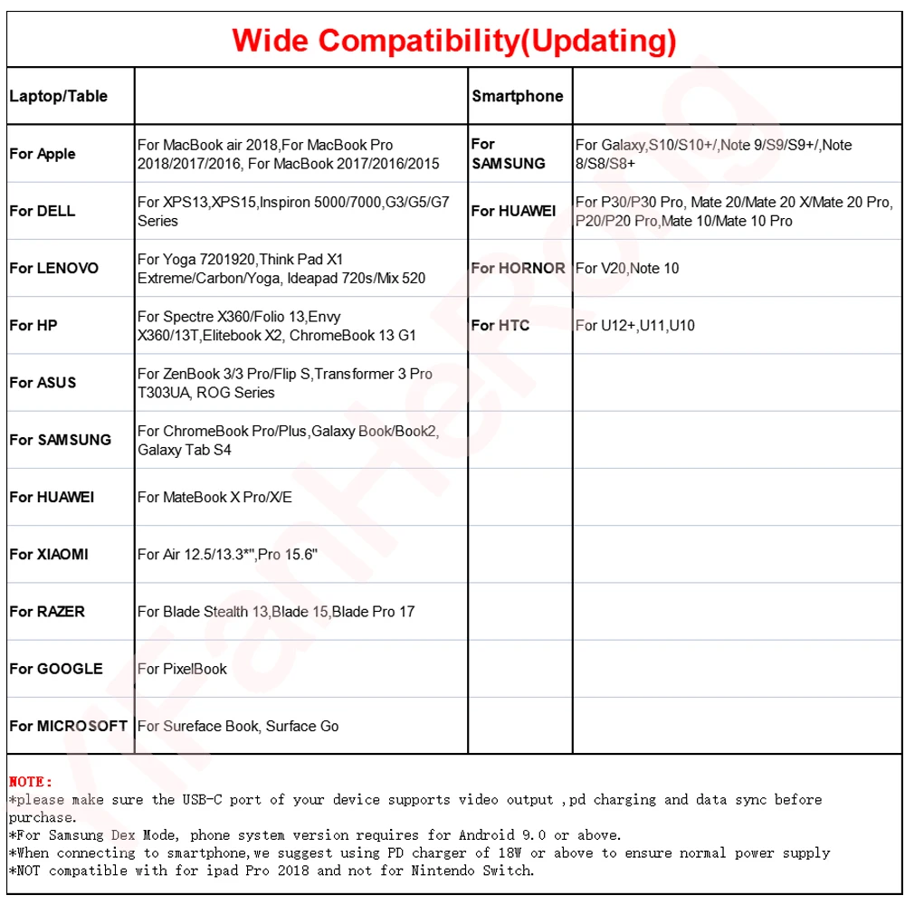 Asegúrese de que su dispositivo sea compatible con la extensión; de lo contrario, no se podrá utilizar.La interfaz tipo C de la computadora portátil debe ser para Thunderbolt 3 o admitir el protocolo USB3.1.