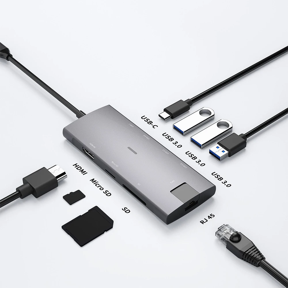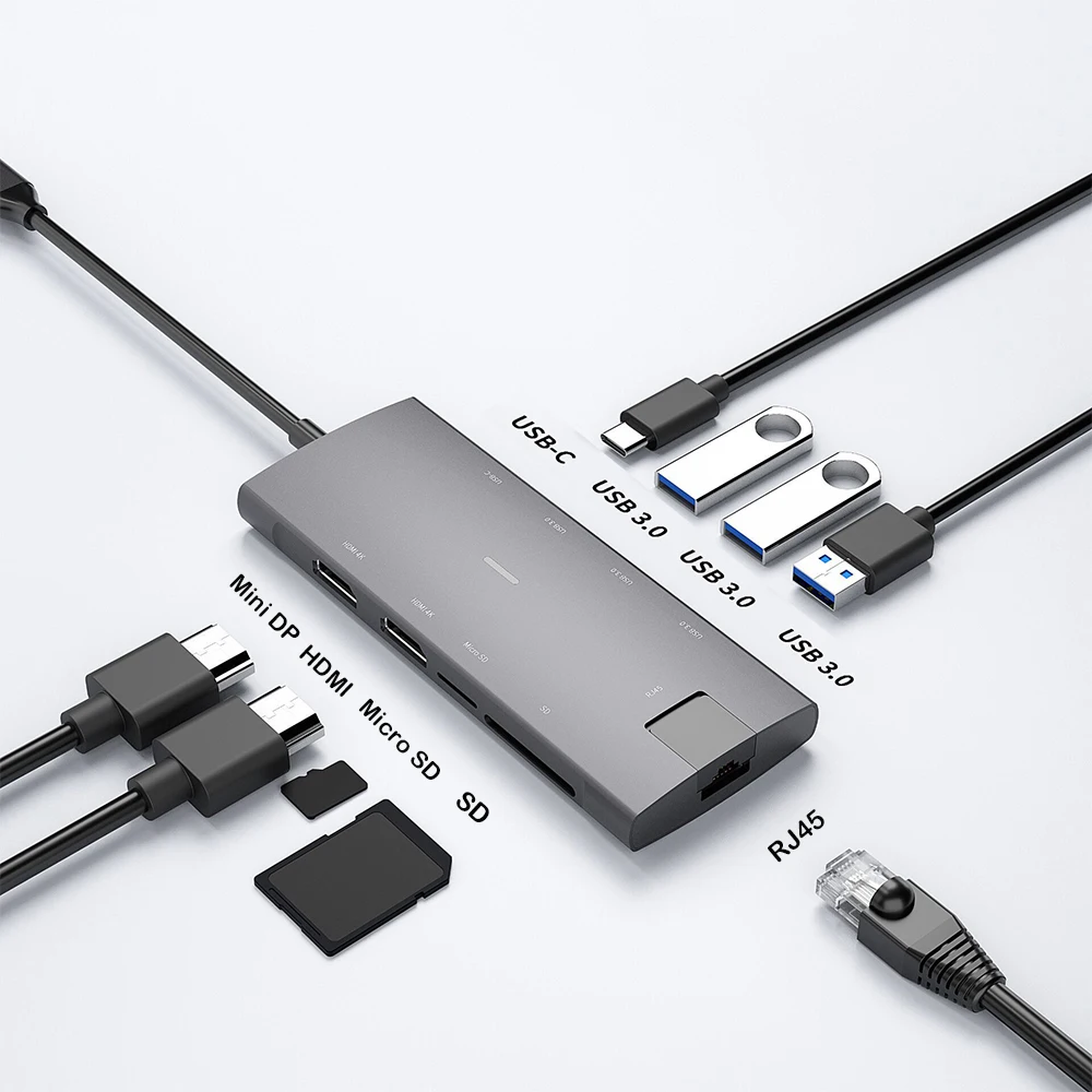 Estación de acoplamiento multifunción 9 en 1: 3 * USB3.0 + 2 + SD + MCRO SD + RJ45 + HDMI + Mini DP