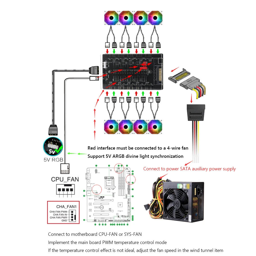 La interfaz roja en el concentrador debe estar conectada a un ventilador con control de temperatura. Se pueden conectar otras interfaces a voluntad, pero cuando se conectan a un ventilador de tres Pines, la velocidad de las otras interfaces no se sincronizará y funcionará a toda velocidad. Esto depende de si se admite el control de velocidad de tres pines. El concentrador no permitirá que un ventilador de tres pines que no admita control de temperatura logre la función de control de temperaturaNota: