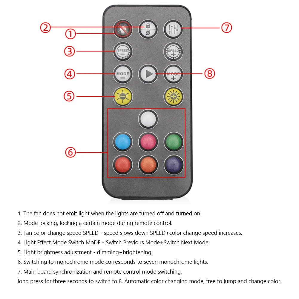 2. Control remoto:El concentrador está equipado con un control remoto que puede controlar el encendido y apagado de la luz, el bloqueo de modo, la velocidad de cambio de color del ventilador, el cambio de modo de efecto de luz, el ajuste del brillo de la luz, sincronización de placa base y cambio de modo de control remoto, y modo de cambio de color automático