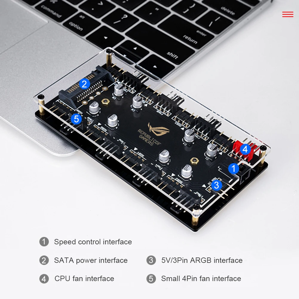1 to 8 Multi Way Splitter RGB PWM Hub PC Speed Controller Adapter Dimming Temperature Control for ASUS/MSI/GIGABYTE/ASRock Motherboards Feature: 1. Intelligent temperature control + light synchronization 2-in-1. PWM temperature control and speed regulation, RGB/ARGB (optional) motherboard synchronization. 2.8pcs 4PIN temperature control interfaces, 8pcs 4PIN RGB/ARGB interfaces, greatly improved expansion capability. 3. The main board light control can be synchronized. Support for ASUS, for MSI, for GIGABYTE, for ASRock motherboards, controlled by the motherboard, can synchronize the light with other ARGB products. 4. Adhesive backing, which can firmly fix the hub in the chassis. 5. Equipped with RGB/ARGB extension cable and small 4P fan speed control cable. Specification: Product name: RGB&FAN hub Power supply interface: SATA interface Material type: 3mm acrylic panel (optional) Interface cable length: about 50cm/19.69 inch RGB extension cable Light interface: 8pcs (4Pin RGB/3Pin ARGB) Light rated voltage: 12V/5V FAN fan port: 8pcs 4Pin/8pcs 3PIN FAN rated voltage: 12V Fixed type: Hook-and-loop Product size: about 110*55*11mm/4.33*2.17*0.43 inch Packing weight: about 40g/67g Note: Before purchasing, please confirm whether the main board lighting interface is 3PIN or 4PIN, please choose our corresponding products for different interfaces, thank you for your understanding. Due to the different monitor and light effect, the actual color of the item might be slightly different from the color showed on the pictures. Thank you! Please allow 1-2cm measuring deviation due to manual measurement. 1*RGB&FAN Hub 1*RGB/ARGB Extension Cable 1*Fan Speed Control Cable ![]() ![]() ![]() ![]() ![]() ![]() ![]() ![]() ![]() ![]() ![]() ![]() ![]() ![]() ![]() |