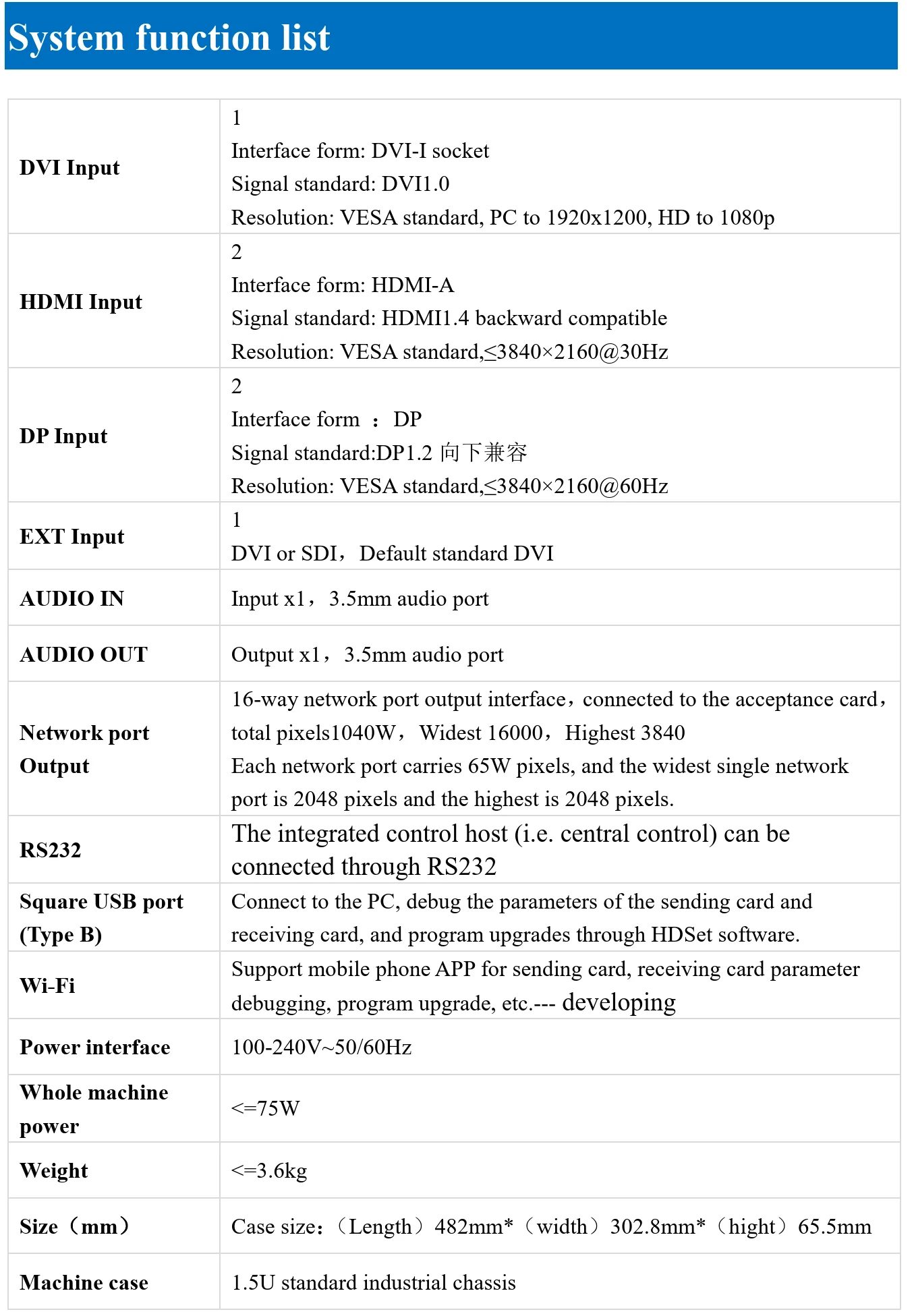 El controlador de pantalla LED de cuatro ventanas, Gigabit Ethernet tiene 16 líneas de salida, la capacidad de carga es de 10,4 millones de píxeles, admite 6 entradas de señal y puede cambiar arbitrariamente, viene con función Wi-Fi, admite control inalámbrico de aplicaciones móviles.