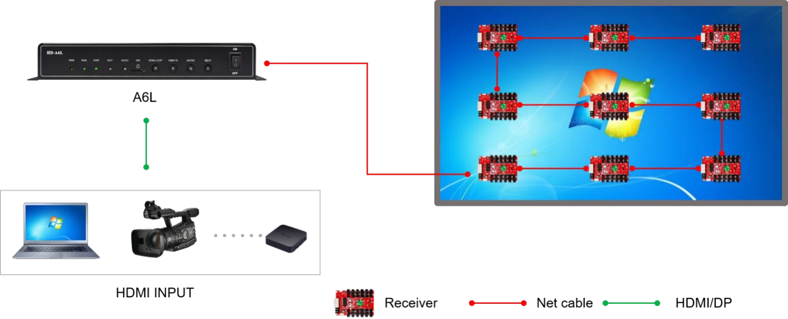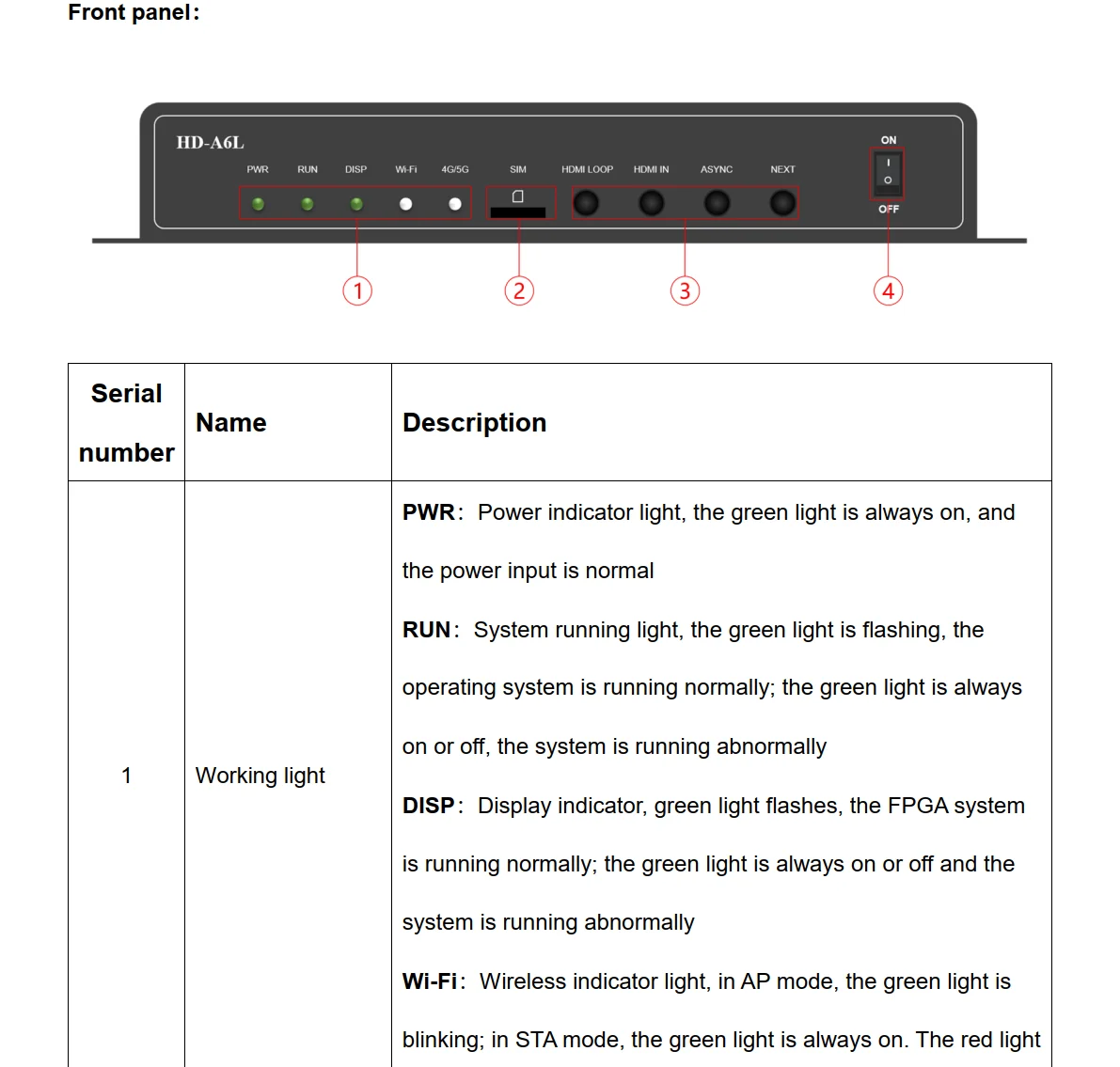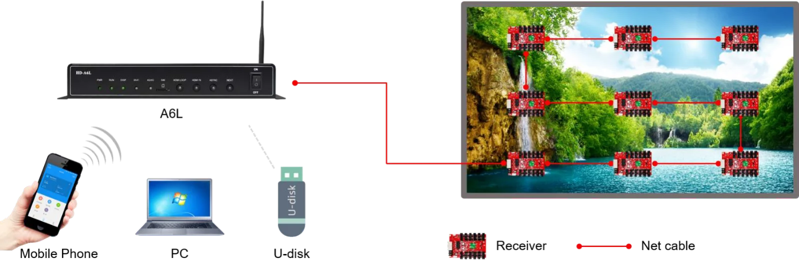 A6L es un reproductor multimedia con pantalla LED que admite la reproducción de vídeos, imágenes, animaciones GIF, textos, documentos WPS, tablas, relojes, cronometrajes y otros programas.Integra funciones como reproducción asíncrona, reproducción sincrónica y reproducción de empalme HD, compatible con programas de liberación y control multiterminal.