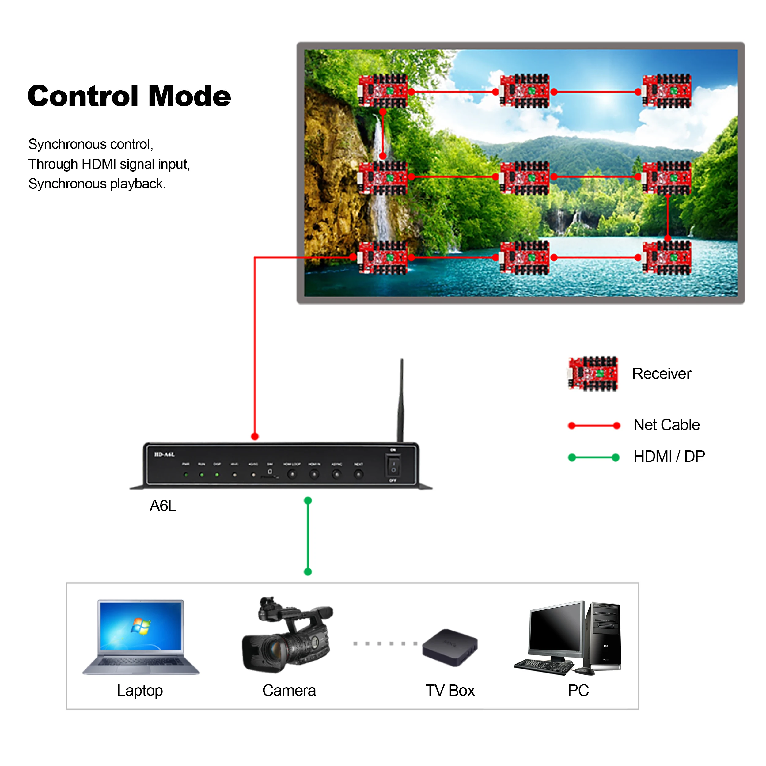 A6L es un reproductor multimedia con pantalla LED que admite la reproducción de vídeos, imágenes, animaciones GIF, textos, documentos WPS, tablas, relojes, cronometrajes y otros programas.Integra funciones como reproducción asíncrona, reproducción sincrónica y reproducción de empalme HD, compatible con programas de liberación y control multiterminal.