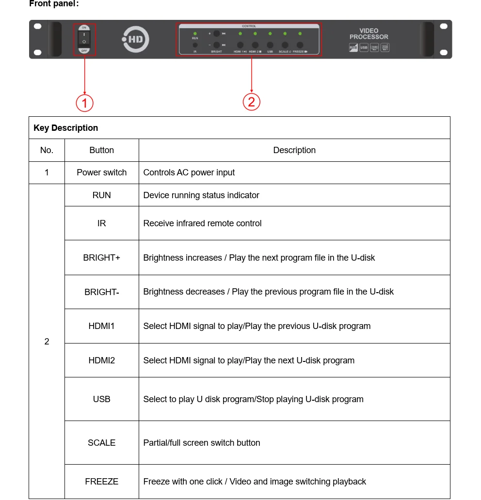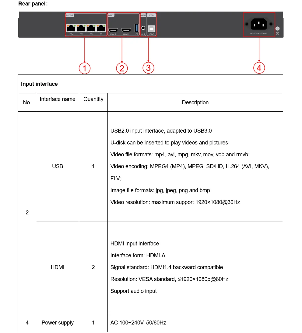 La entrada USB de 1 canal admite la reproducción directa de videos e imágenes en varios formatos principales en el directorio raíz de la unidad flash USB, y admite hasta 1920 × 1080 @ 30Hz reproducción de vídeo de alta definición;