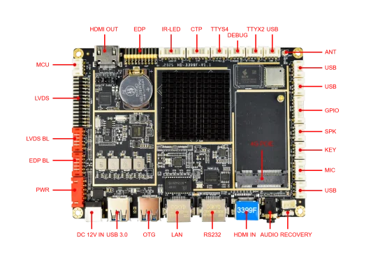 ● Alta integración. La placa integrada integra Ethernet, EDP, Wi-Fi, amplificador de potencia, puerto de expansión USB, función de control remoto IR, HD, LVDS, control de retroiluminación, micrófono y otras funciones, simplificando en gran medida el diseño general.