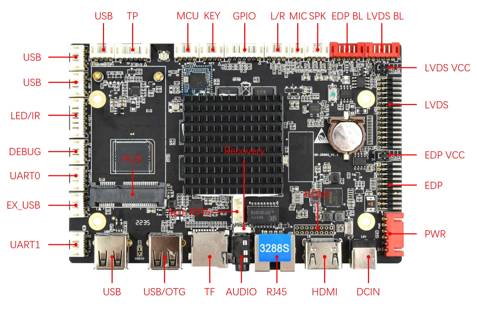 ● Alta integración. La placa integrada RK3288 de Android integra Ethernet, EDP, Wi-Fi, amplificador de potencia, tarjeta de expansión TF, puerto de expansión USB, función de control remoto IR, LVDS, control de retroiluminación, micrófono y otras funciones, simplificando enormemente el diseño general.