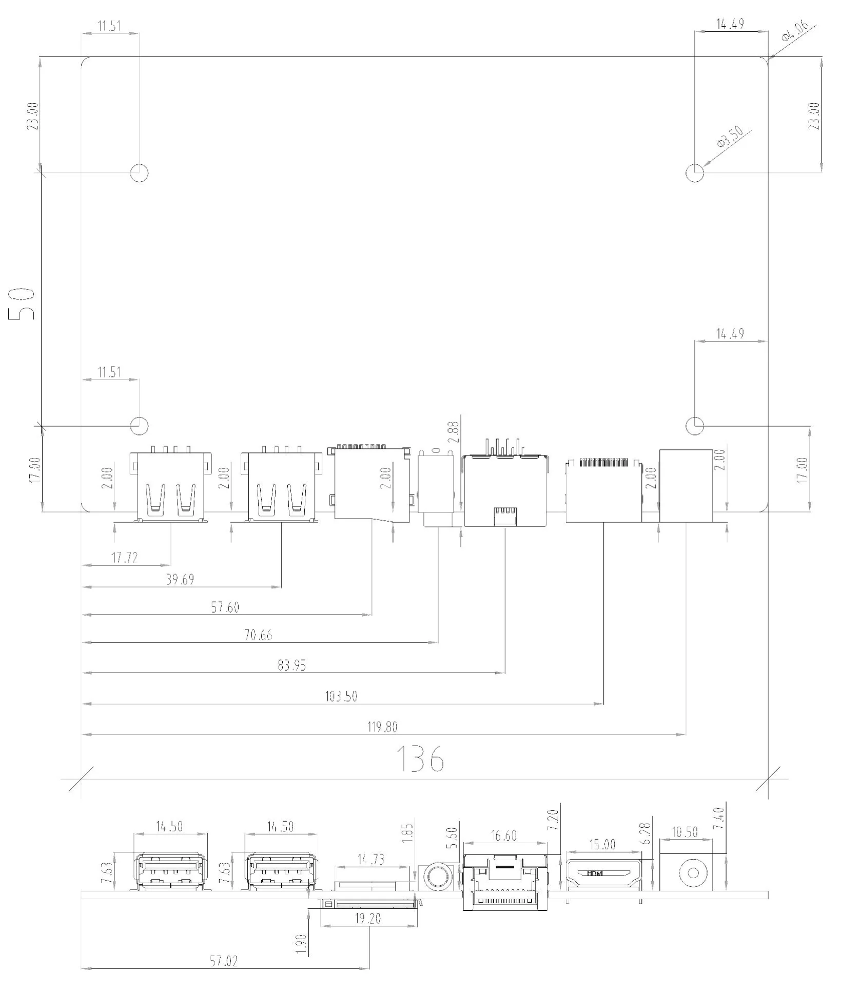● Alta escalabilidad. SEIS puertos USB de expansión (PIN son de tipo 4 puertos, 2 puertos son de tipo estándar), 2 puertos serie + 1 puerto serie de depuración expandible, cinco puertos de expansión IO pueden expandir más dispositivos periféricos.